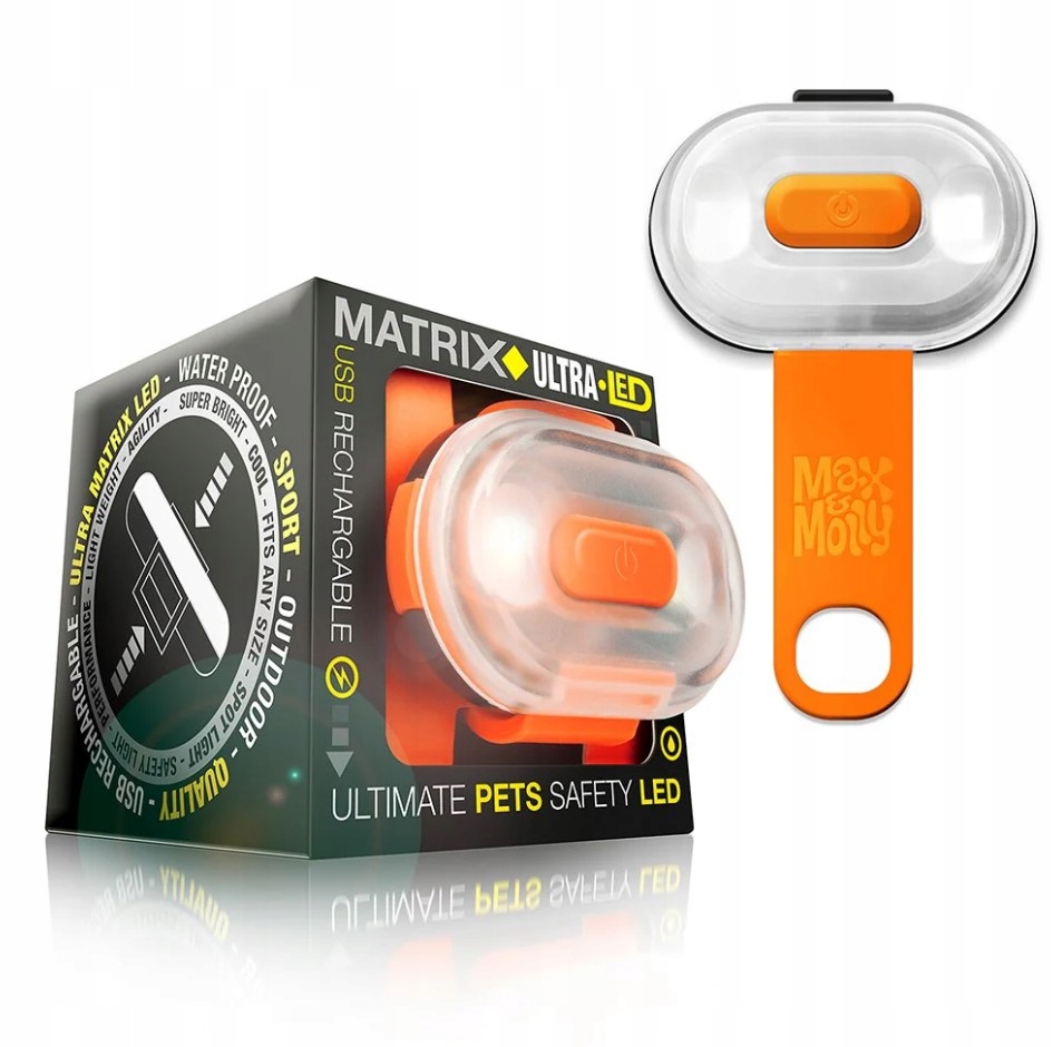 max & molly matrix ultra led безопасная свет - идеальный компаньон прогулок в темноте. Чрезвычайно прочная светодиодная лампа обеспечивает превосходную видимость и безопасность в темноте. Водонепроницаемое корпус эффективно защищает от дождя и влаги. Лампа имеет 4 уровня регулировки яркости, в том числе практический сигнальный свет, а срок службы батареи составляет 13 часов. Время зарядки с использованием USB -кабеля, прикрепленного к набору, составляет всего 30 минут. Гибкая силиконовая лента позволяет прикрепить лампу к воротнику, коляску или на поводке. Вес 14 грамм обеспечивает комфорт