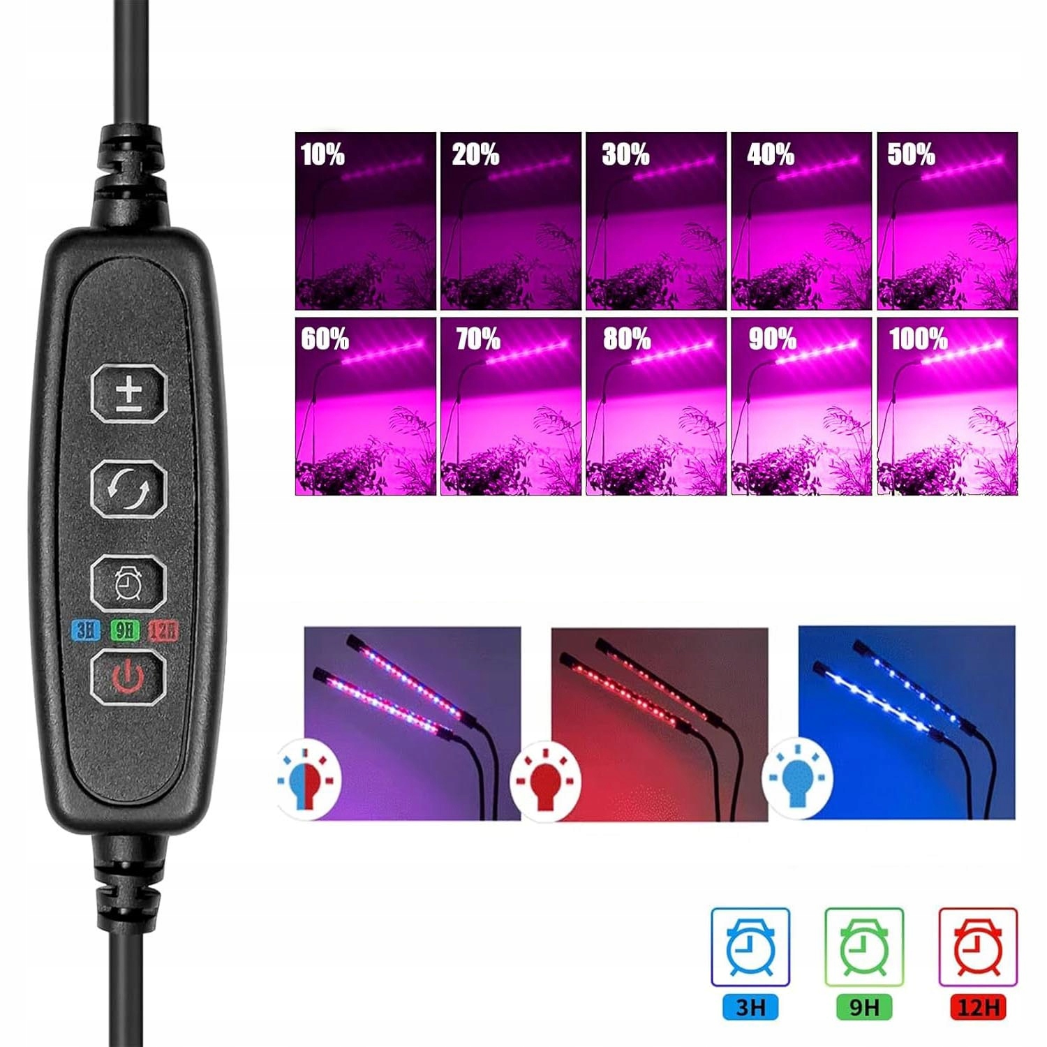 🌱【Таймер на 3/9/12 часов】 Светодиодную лампу для растений можно установить на 3 режима. /9 /12 часов в зависимости от суточной потребности завода. Освещение для выращивания растений включается каждый день в соответствии с вашими настройками, поэтому о ваших растениях будет хороший уход, когда вас нет дома. Примечание. Эта функция таймера представляет собой 24-часовой цикл таймера. В случае непрерывного электропитания цикл работает, а при выключении он неправильный.