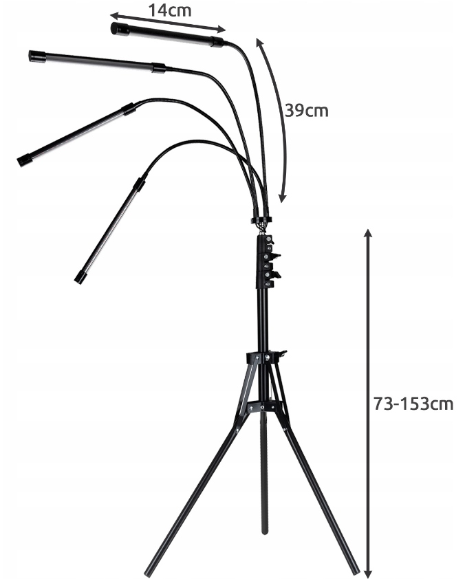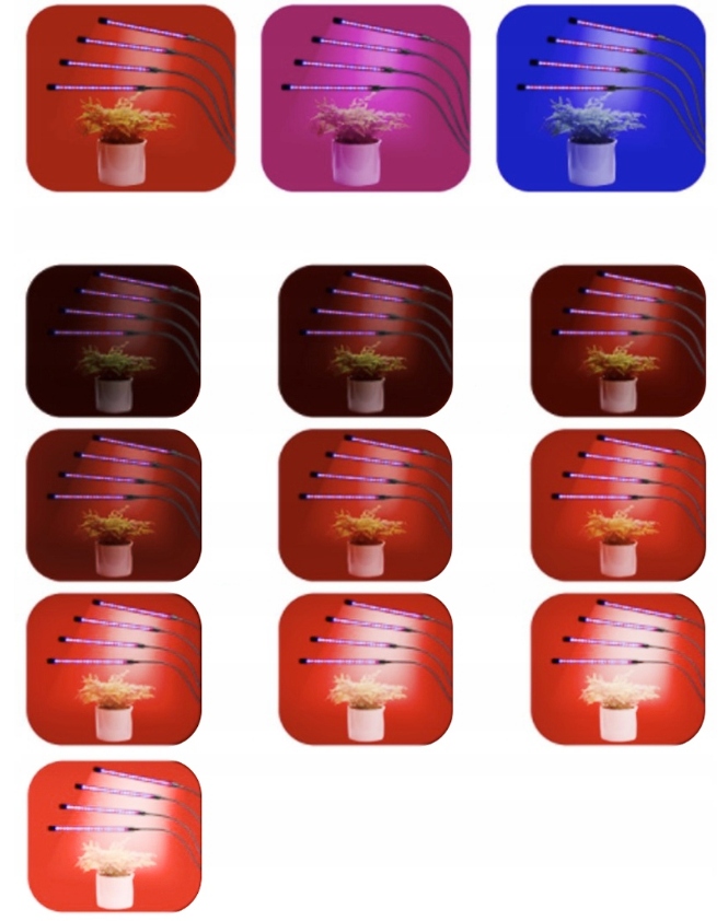Лампа имеет 4 отдельных гибких кронштейна с подсветкой, ее можно разделить на несколько цветов или на две стороны, например, сверху, справа и слева от растения. Каждое оголовье может светиться отдельно.