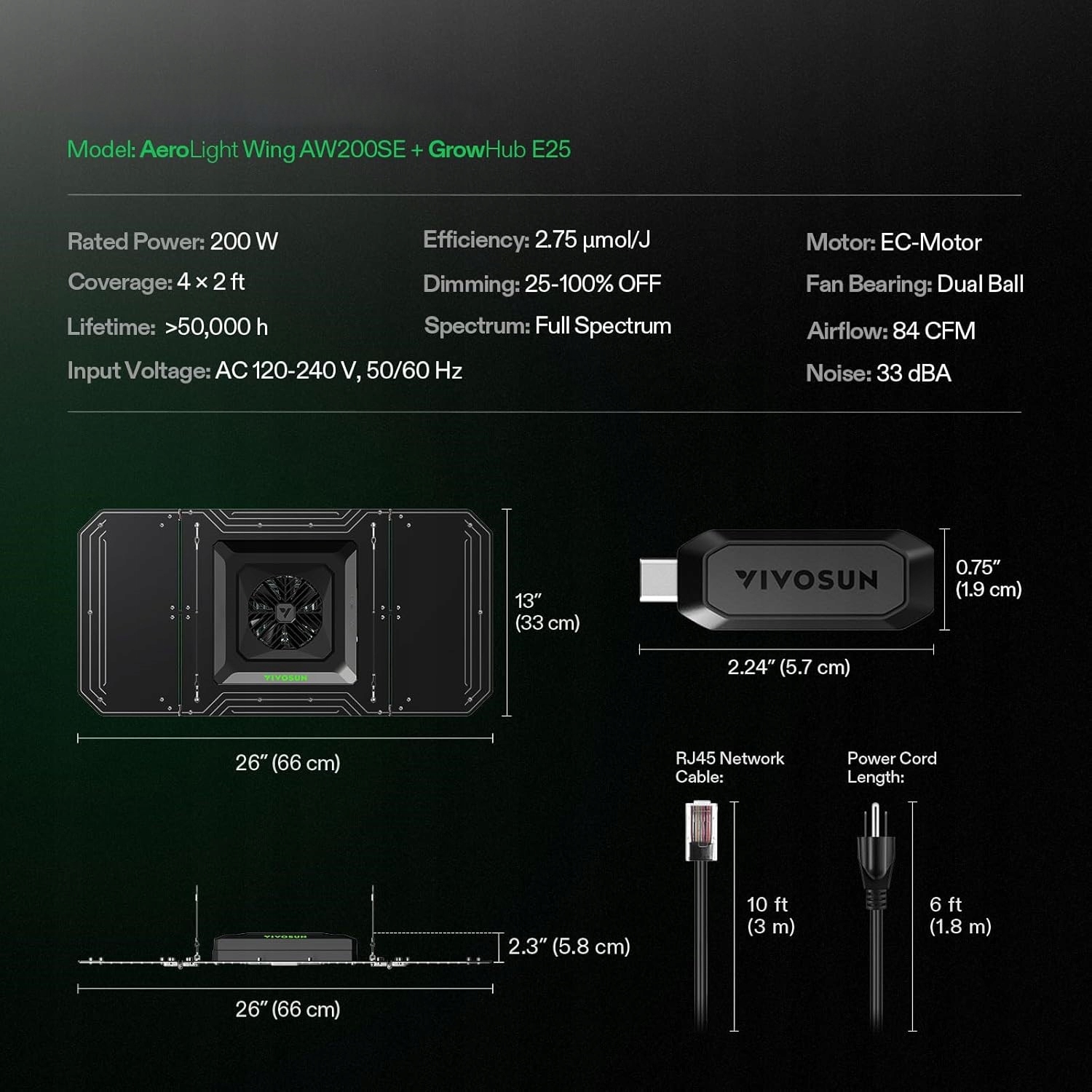 - GrowHub E25: подключитесь к системе VIVOSUN Smart Grow, чтобы вы могли контролировать и управлять AeroLight через приложение VIVOSUN; Подключайте широкий спектр устройств и разрабатывайте рецепты выращивания, которые автоматически проведут путь от посева до сбора урожая.