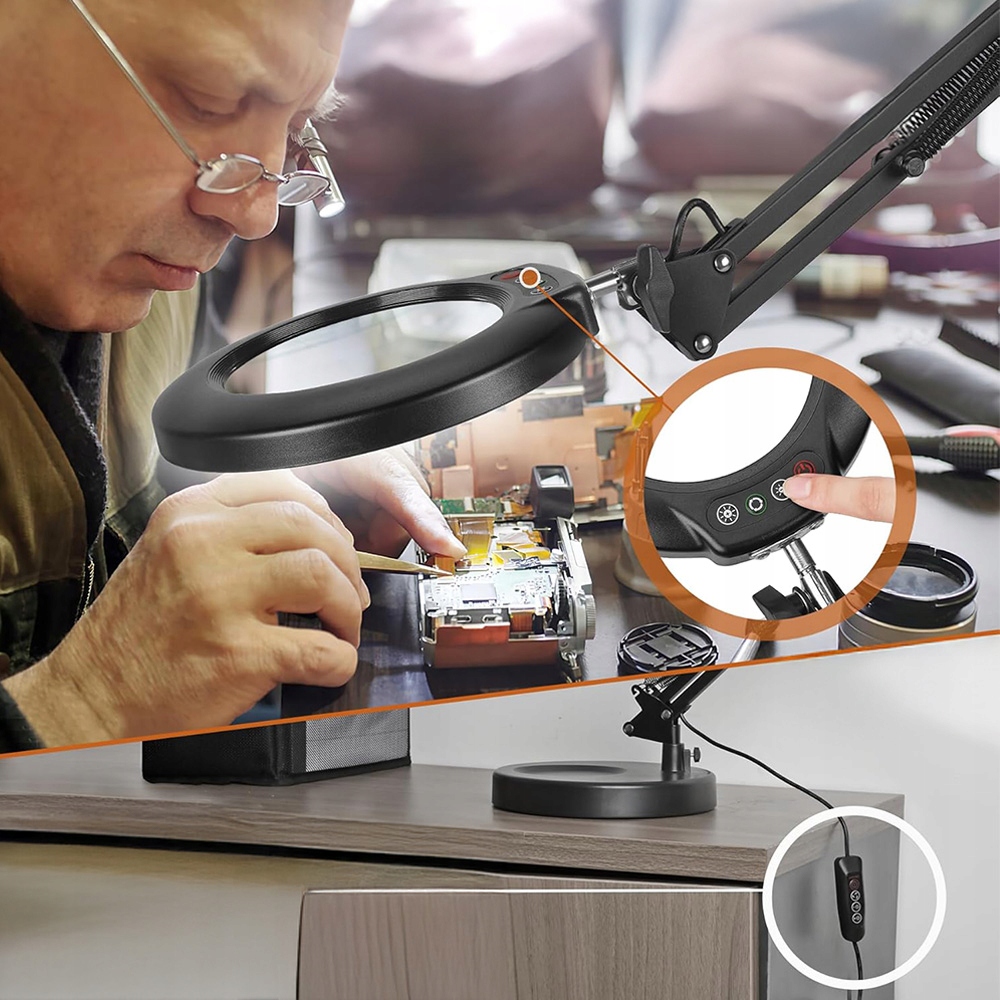 В отличие от других продуктов с проводным переключателем, наш продукт имеет улучшенную кнопку переключения на головке лампы. Кнопка переключения у вас в руках, вы можете легко управлять светом увеличительного стекла, вам больше не нужно смотреть вниз, чтобы найти шнур питания для управления переключателем, который обеспечивает комфорт во время ремонта, ювелирных изделий, чтения, пайки и других работ, выполненных вблизи.