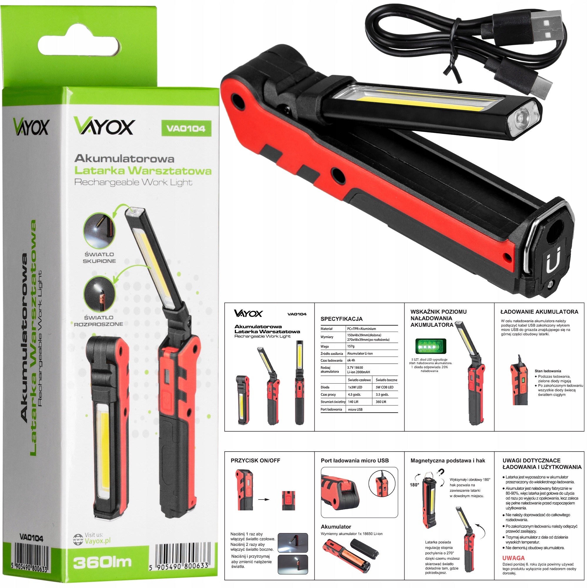 СВЕТОДИОДНАЯ ЛАМПА ДЛЯ МАСТЕРСКОЙ РАБОЧАЯ ЛАМПА С МАГНИТНЫМ КРЮКОМ ДЛЯ РЕГУЛИРОВКИ USB-C VAYOX