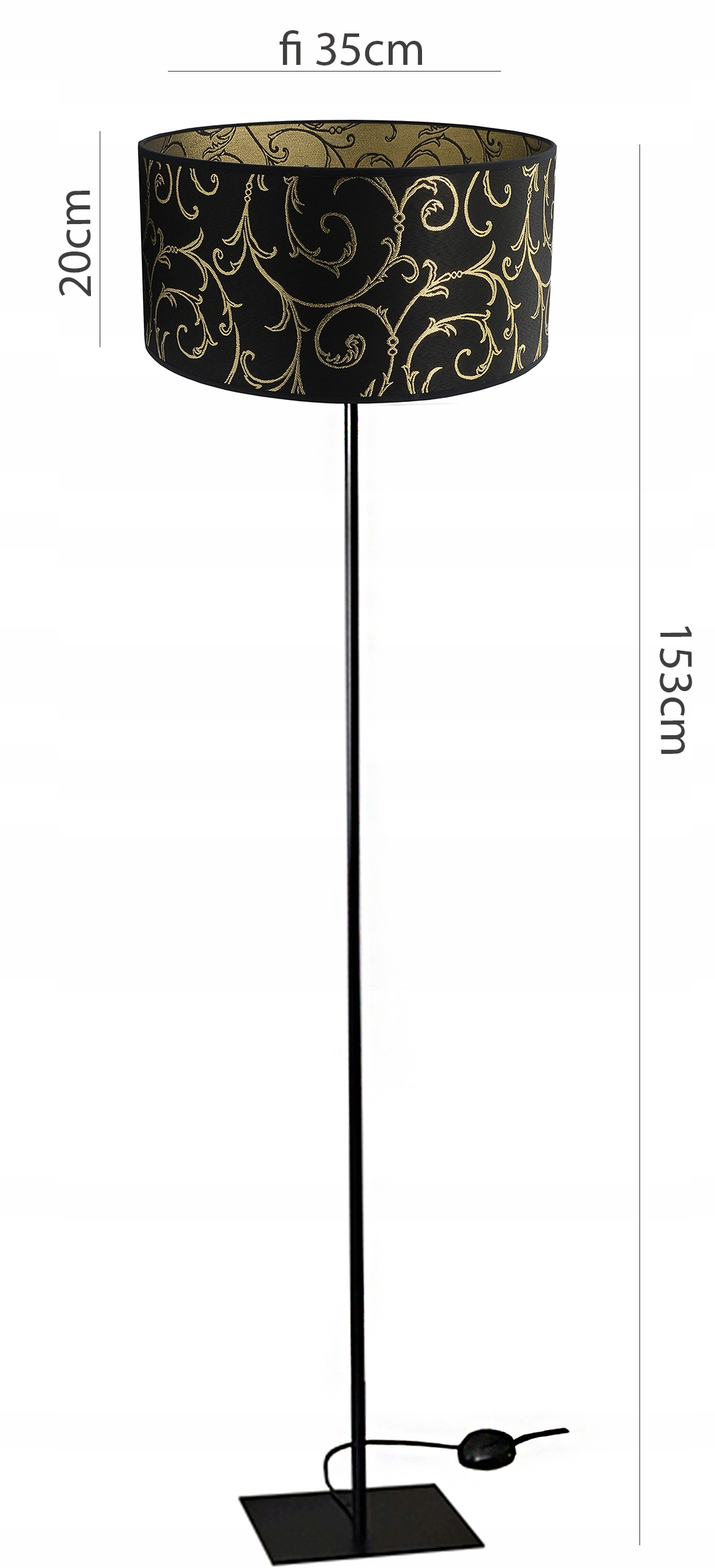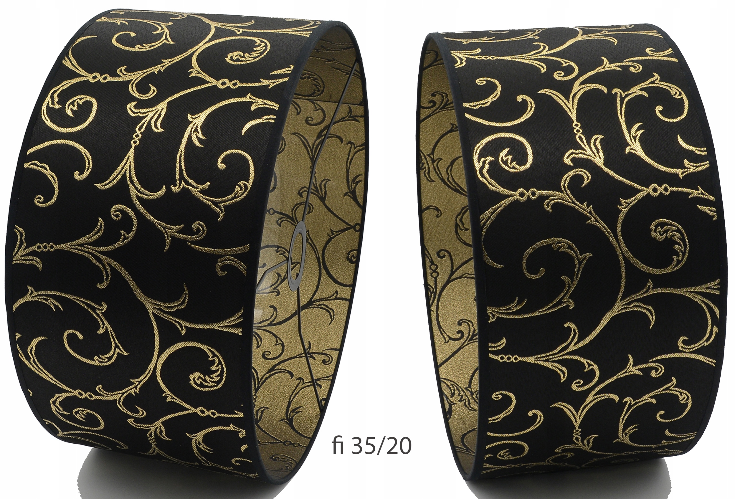 - Элегантный абажур диаметром 35 см, сделанный из черной ткани с декоративным золотым узором.