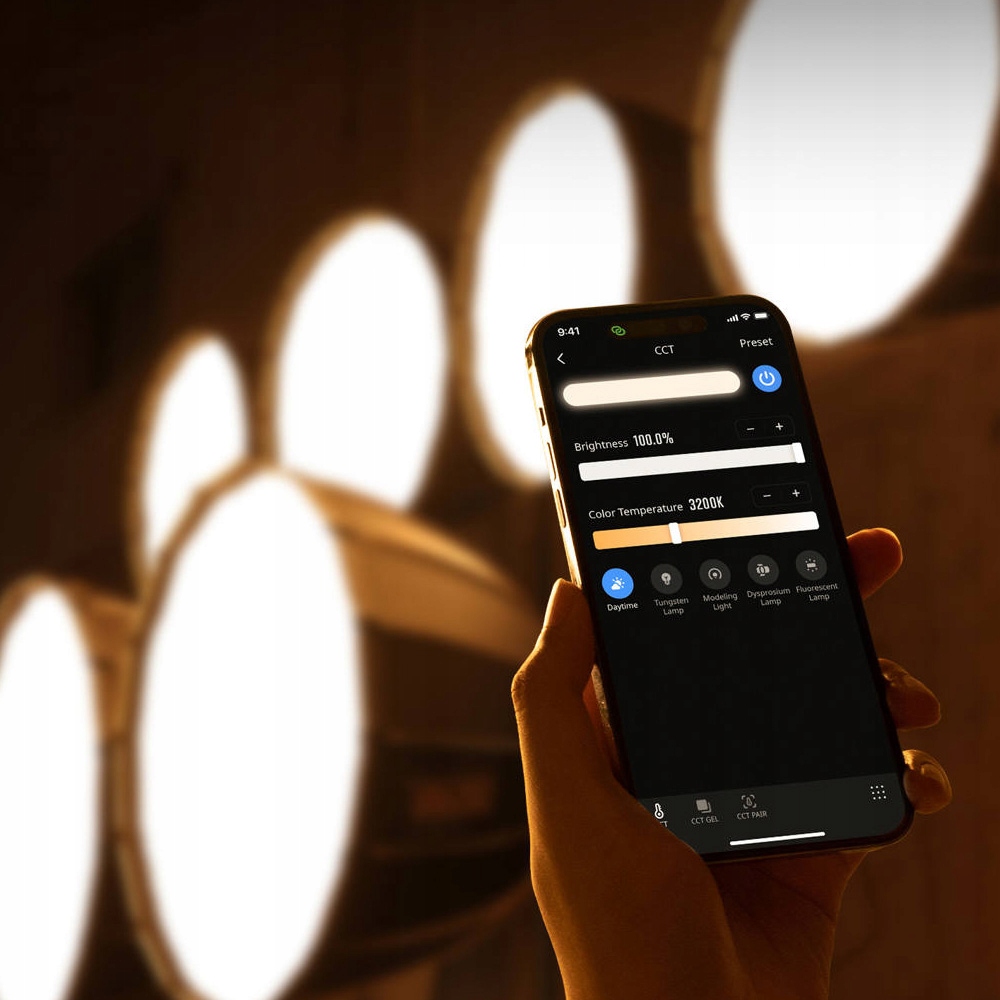 Поддерживает плавную регулировку CCT и DMI с пятью встроенными кнопками для легкой регулировки цветовой температуры и яркости.