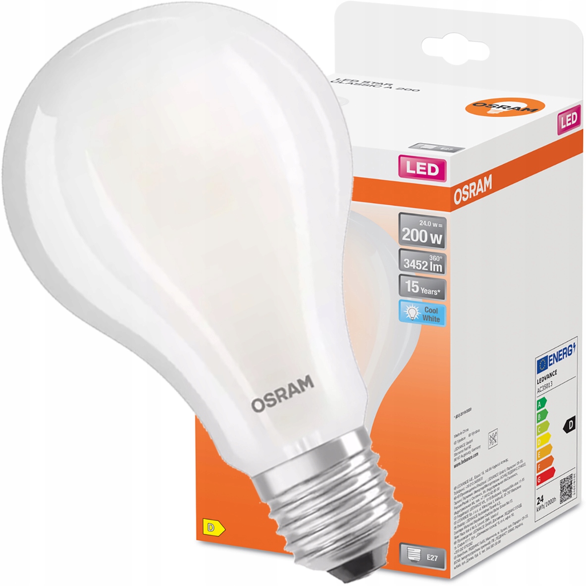 Светодиодная лампочка репутационной и признанной в осветительной промышленности серии osram из серии Star с ручкой e27 света света 300 ° и мощности 24 Вт (эквивалент к традиционному 200W Light) нейтральный. и световой поток 3452LM.
