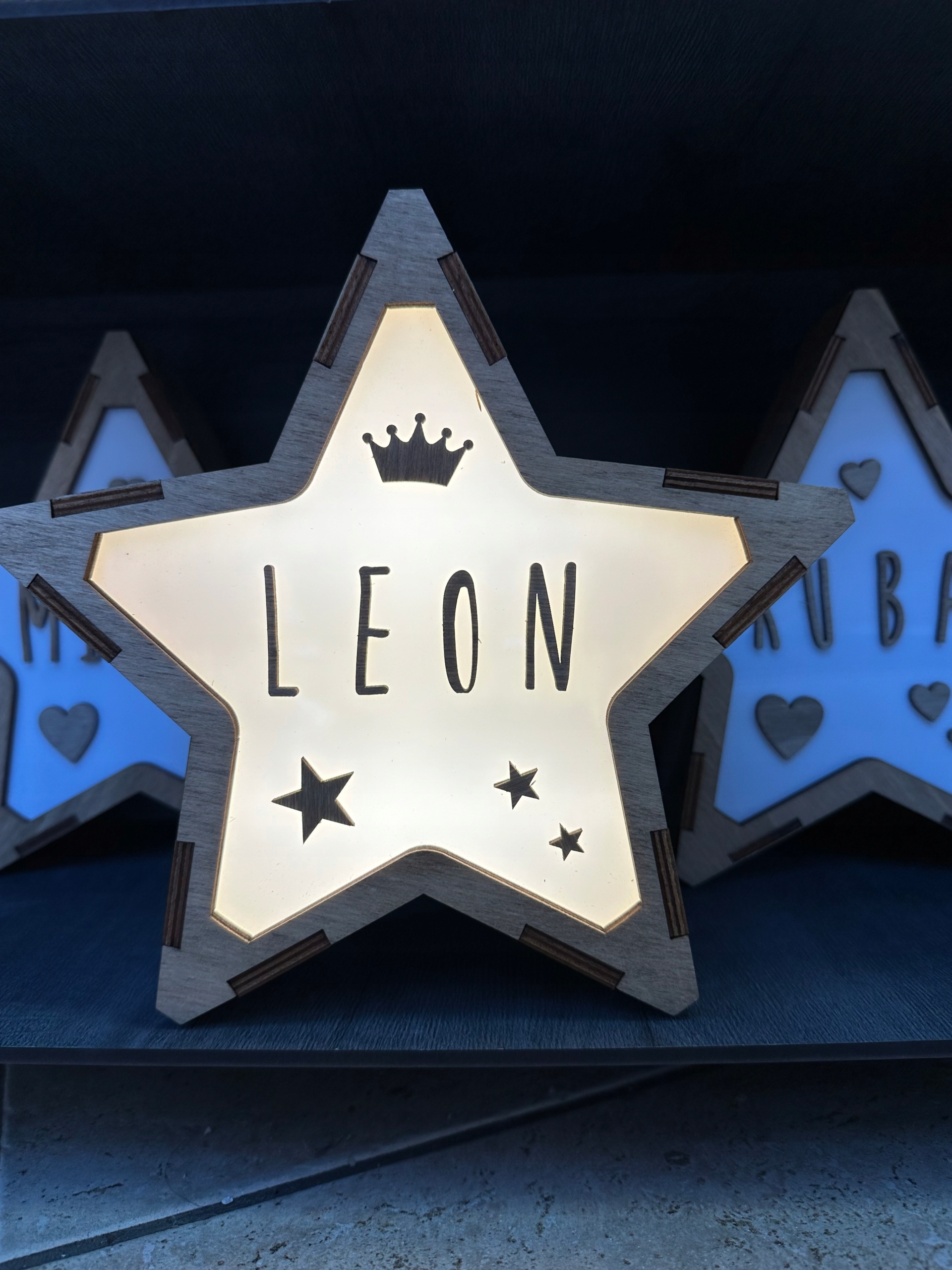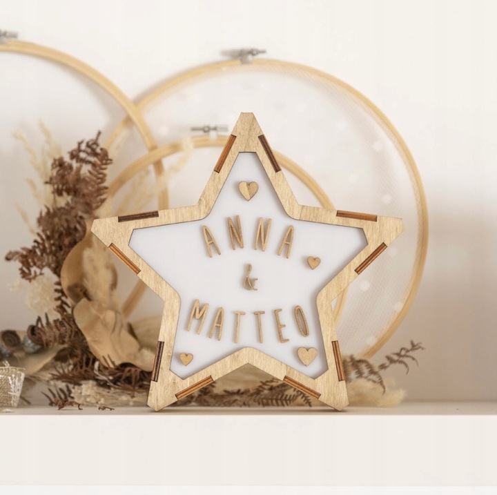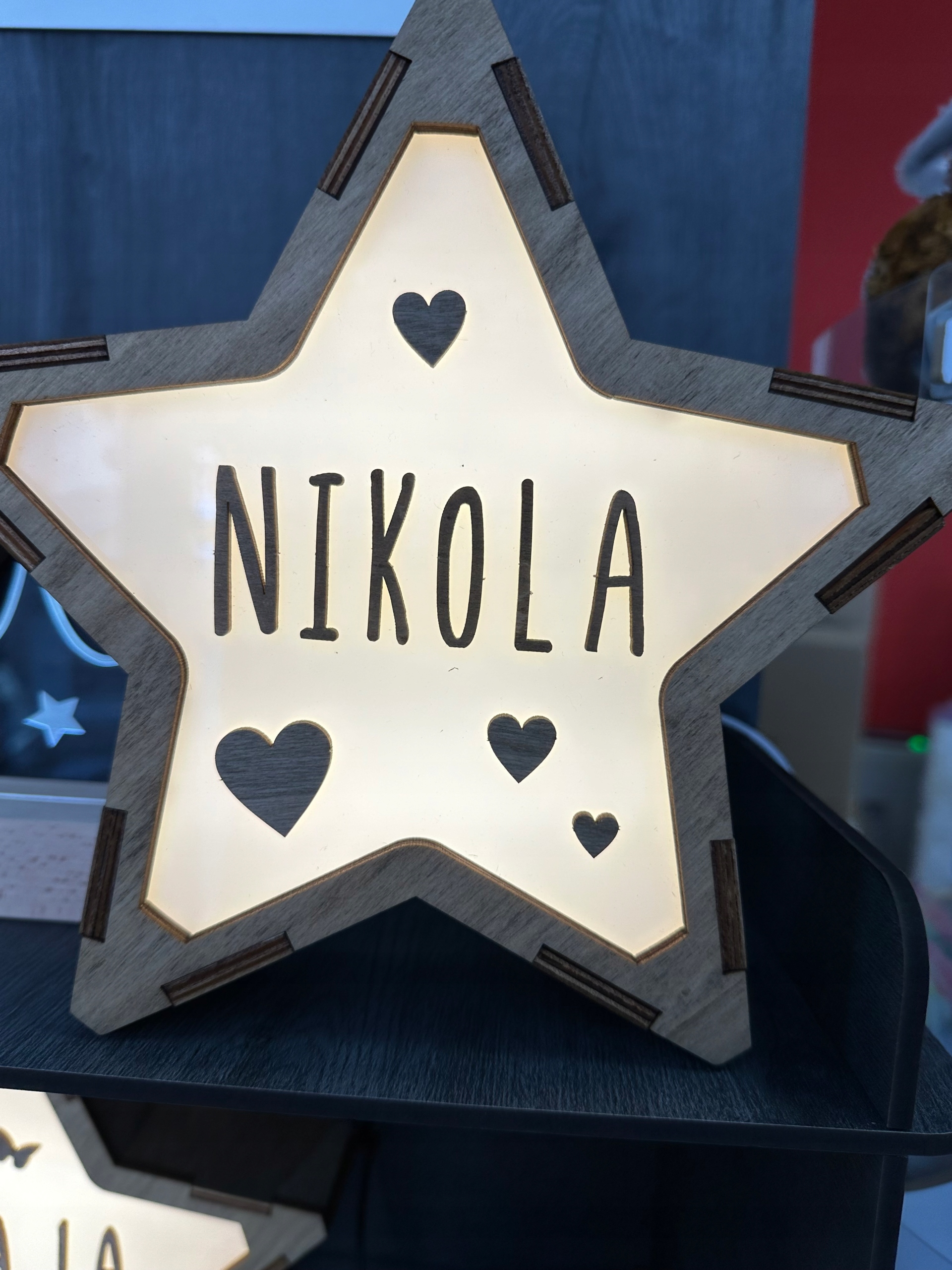 Светодиодная лампа при постели с названием для детей на батареях USB-C Деревянная звезда