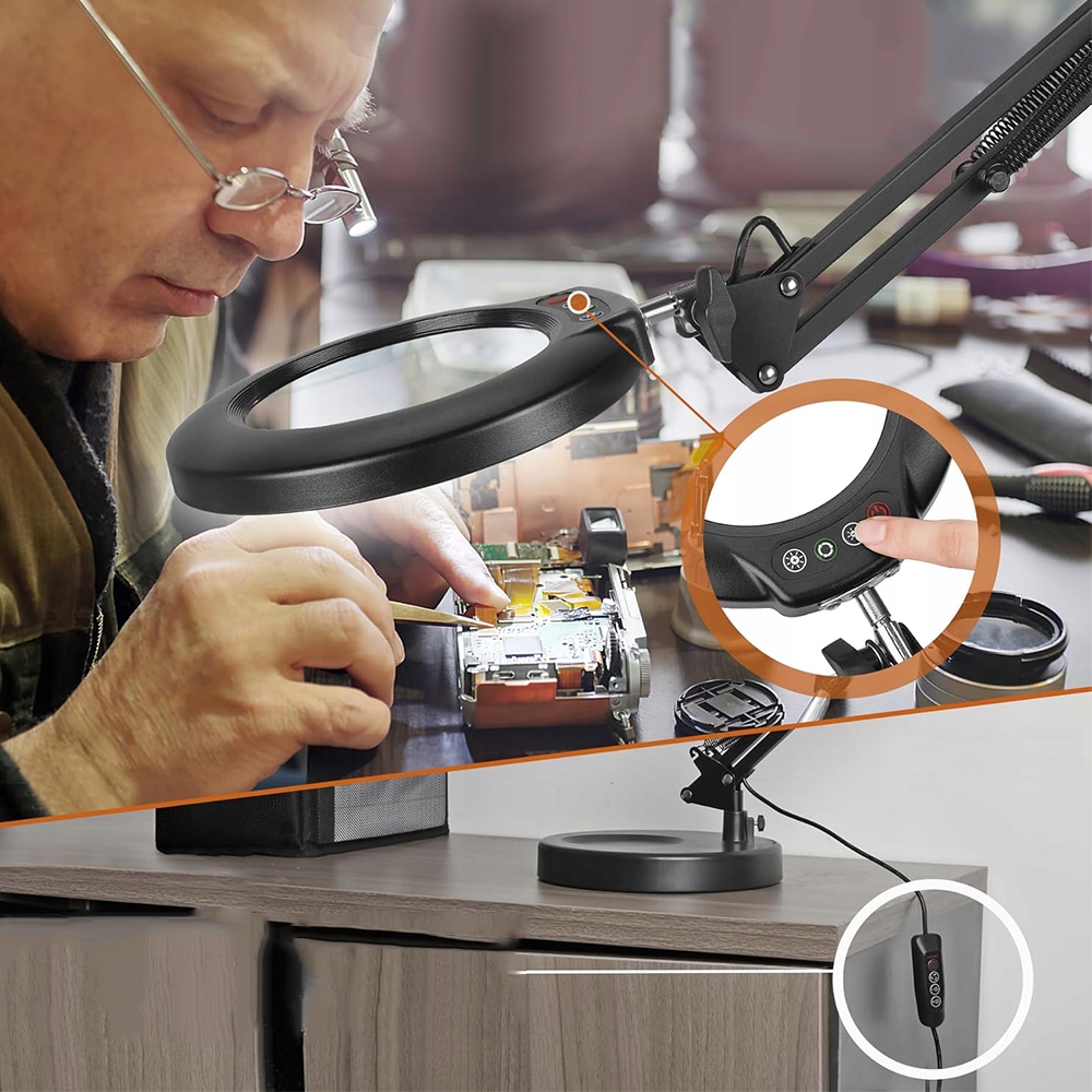 В отличие от других продуктов с проводным переключателем, наш продукт имеет улучшенную кнопку переключения на головке лампы. Кнопка переключения находится в пределах легкой досягаемости, что позволяет легко управлять увеличительным светом. Вам больше не придется смотреть вниз, чтобы найти шнур питания для управления выключателем. Это дает вам удобство при ремонте, изготовлении ювелирных изделий, чтении, пайке и других работах крупным планом.