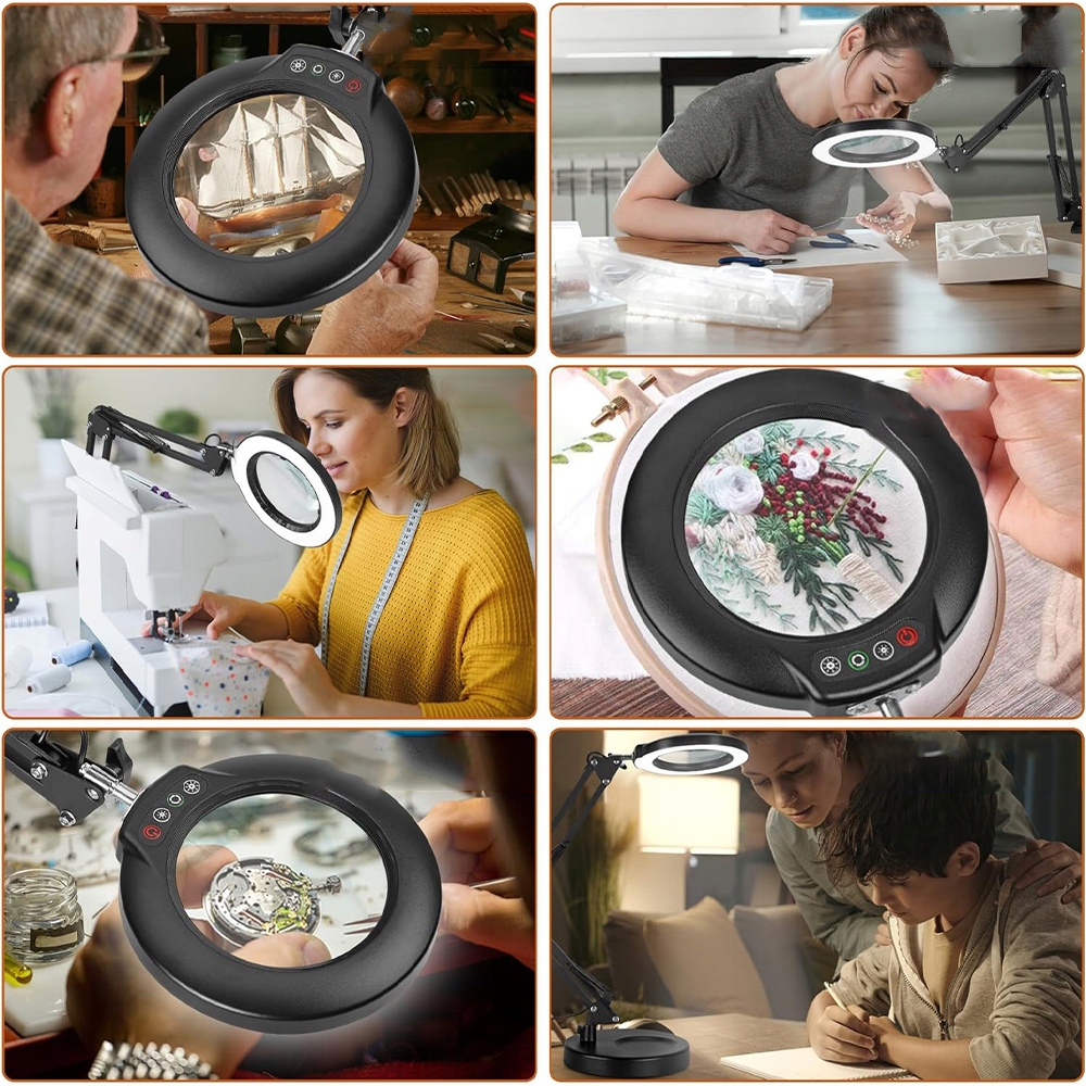 Настольная лупа со подсветкой имеет 5 цветовых режимов и 10%-100%яркость с непрерывным затемнением, что позволяет регулировать цвет и яркость света в различных условиях в соответствии с различными потребностями в освещении при работе вблизи. Лампа с увеличительным стеклом имеет функцию памяти, которая сохраняет режим и яркость с момента последнего использования. Отсутствие бликов и мерцания защищает глаза и снижает утомляемость.