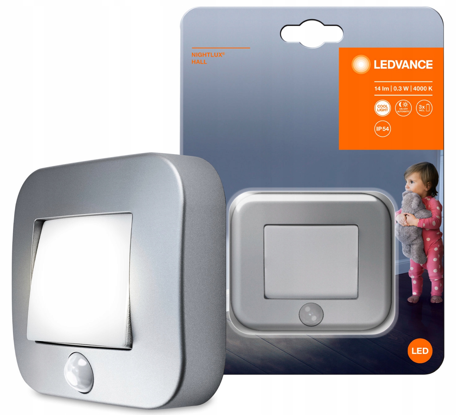 Светодиодный ночник Nightlux Hall, на батарейках, серебристый, 0,25 Вт, 14 лм, 4000 К, IP54, датчик движения LEDVANCE