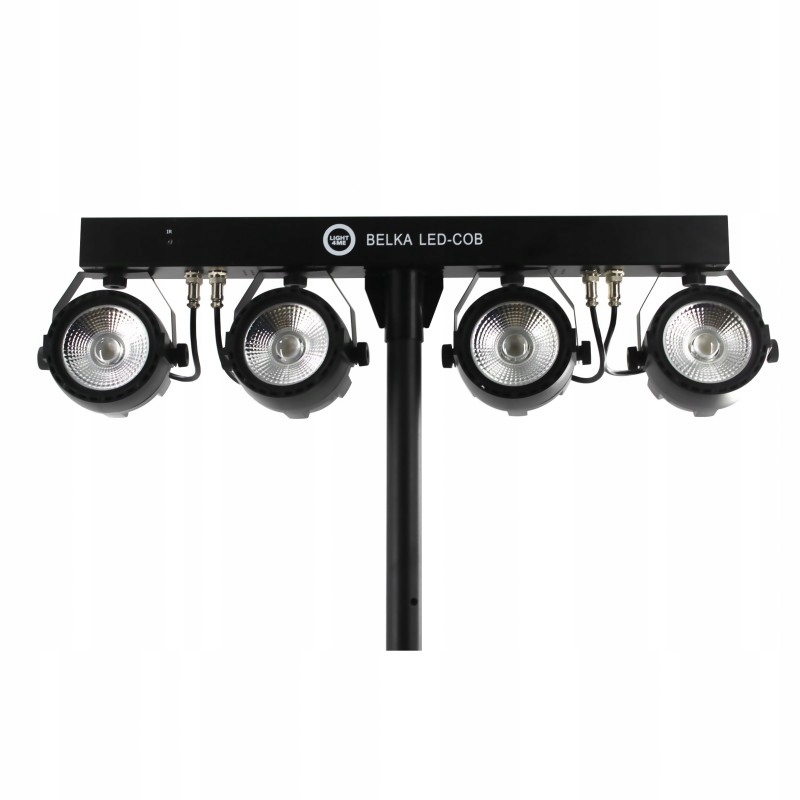 LIGHT4ME COB PAR LED BEAM — это полный набор освещения. Его наиболее важной частью являются 4 сплошных отражателя LED PAR с диодами COB (Chip On Board). Каждый отражатель имеет мощность 30 Вт и работает в цветовой палитре RGB (красный, зеленый, синий). Освещение смонтировано на 66-сантиметровой полосе, на которой на задней стороне корпуса имеется панель управления, состоящая из четырех кнопок (Меню, Вверх, Вниз, Ввод) и светодиодного дисплея. Управление работой установки возможно также с помощью пульта, а также – благодаря разъемам DMX (вход/выход) – с внешних контроллеров и консолей. Система с помощью встроенных программ также может работать автоматически или в гармонии со звуком.