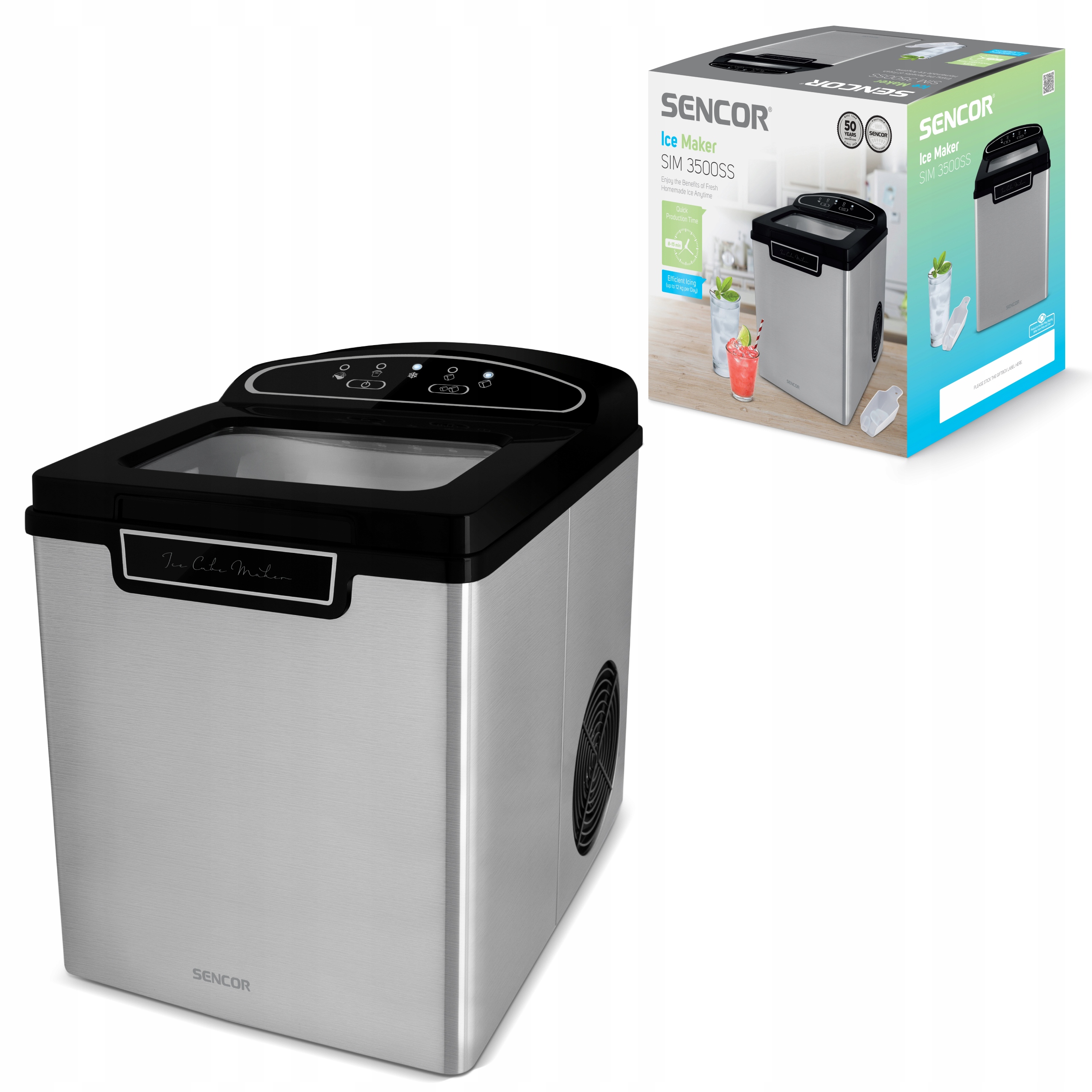 Льдогенератор Sencor SIM 3500SS — это не только компактная и удобная конструкция, но и тщательно продуманное интеллектуальное устройство. Когда контейнер для льда заполнен или вода израсходована в течение нескольких циклов замораживания, устройство автоматически выключится. Светодиодная панель показывает, когда кубики готовы к сбору.
