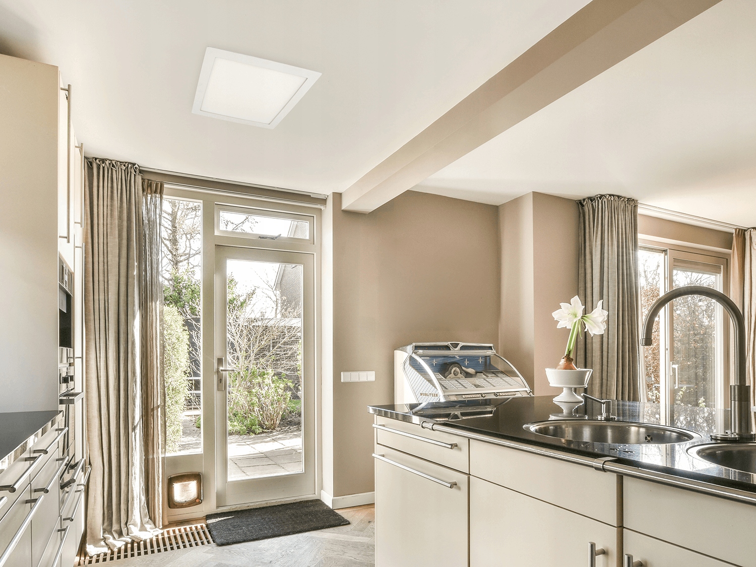 ✔ панель находится на одном уровне с потолком, поэтому ее можно установить над высоким шкафом