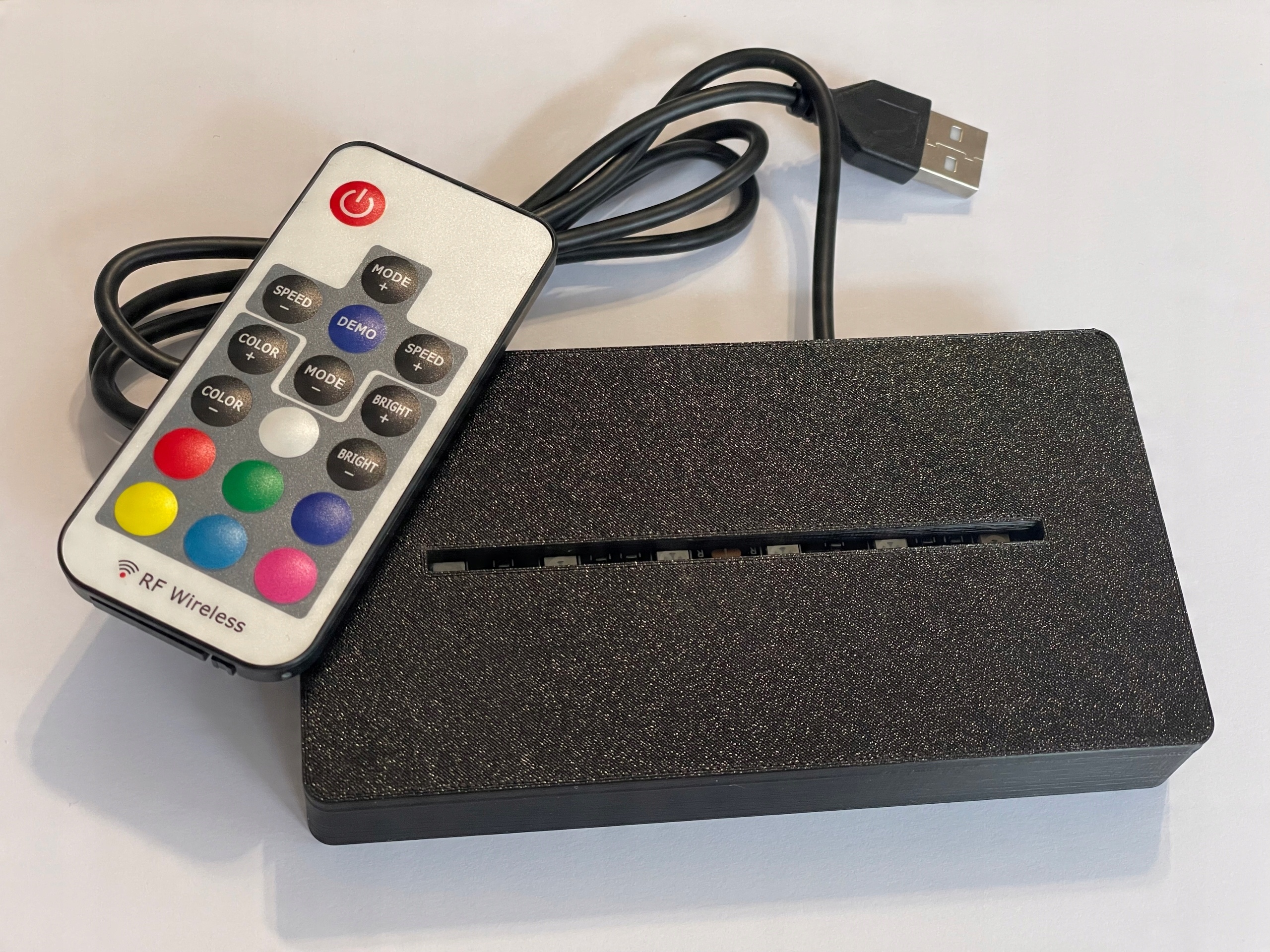Подставка, светодиодная основа для светильников из оргстекла толщиной до 3мм. Подставка с вмонтированной RGB лентой (разные цвета подсветки) и в комплекте RF-пульт! (гораздо лучше, чем инфракрасные пульты дистанционного управления) и постоянно прикрепленный к подставке кабель с USB-разъемом длиной около 95 см (это дает большие возможности подключения источника питания).Размеры подставки около 130х70х20 мм с оргстеклом. головка размером 90-92х3 мм.