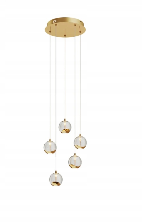 Очень современный дизайн со стеклянными плафонами и золотыми аксессуарами придает свету очень теплый и уютный цвет.