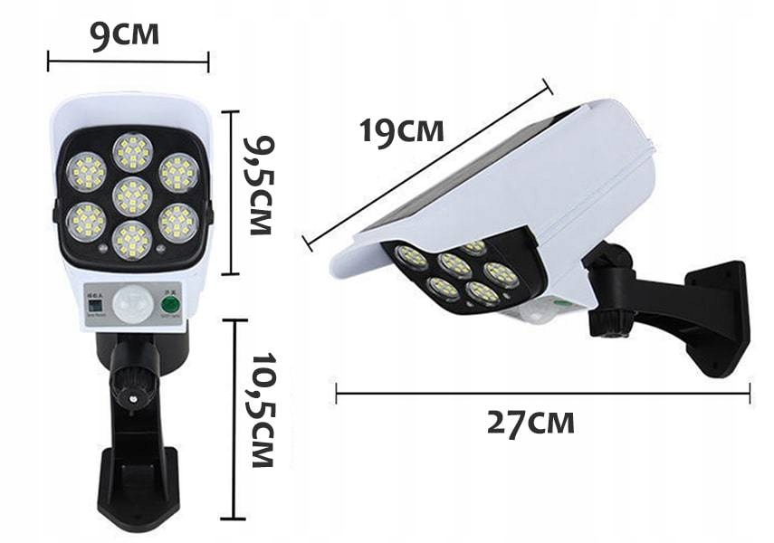 Высококачественный макет камеры наблюдения. Создается впечатление реалистичной камеры на солнечной энергии. Манекен также имеет функцию SMD LED ЛАМПЫ мощностью 77 LED SMD, которая имеет встроенный датчик движения и сумерек