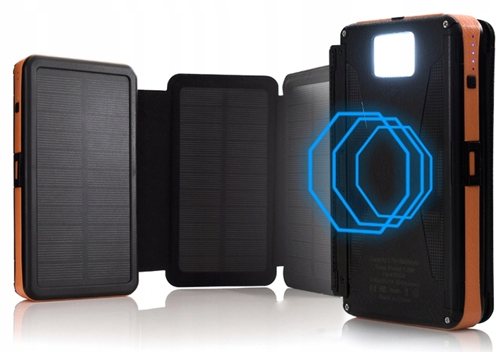 Пауэрбанк оснащен тройной солнечной панелью, благодаря которой его можно заряжать, используя «энергию природы». Три панели общей мощностью 1,8 Вт способны сохранить работоспособность вашего телефона в кризисных ситуациях, а длительное пребывание под прямыми яркими солнечными лучами способно зарядить павербанк. Благодаря встроенному держателю (петле) вы можете прикрепить расширенный павербанк к рюкзаку и заряжать его, например, в походе.
