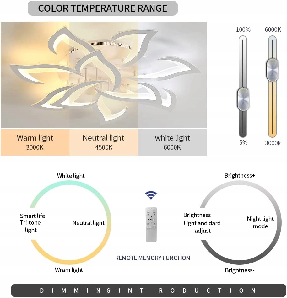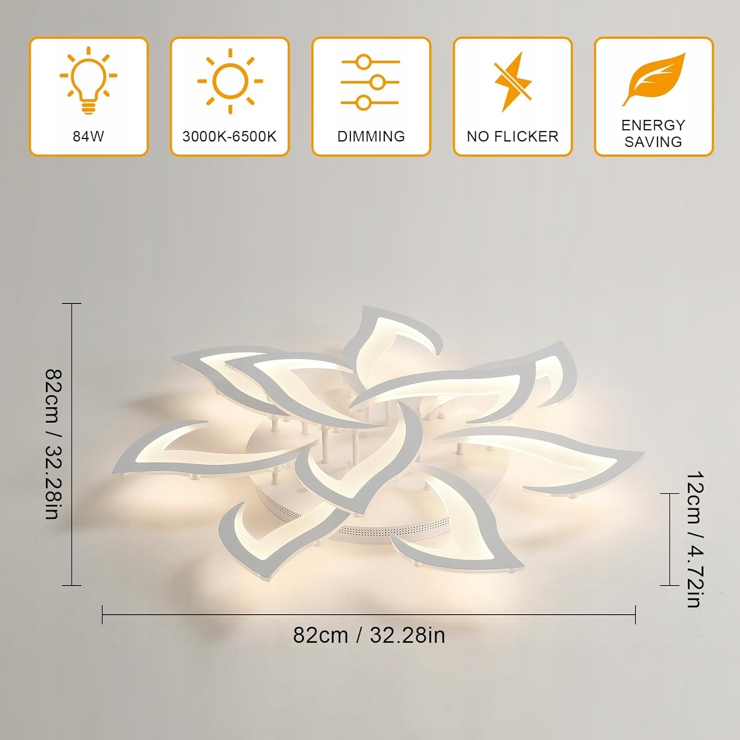 ✿ Творческий дизайн: корпус лампы с лепестками создан творчески, с инновационным дизайном и уникальным стилем, является идеальной лампой для отделки внутренних дел, с очаровательной внешностью и реальной привлекательностью в течение дня, обеспечивая очаровательное настроение благодаря ярким источникам света. дистанционное управление может регулировать яркость затемнения и 3 температуры цвета, чтобы удовлетворить различные потребности (теплый белый, теплый белый, нейтральный белый, холодный белый 6000K) после повторного активирования света, когда включается потолочное освещение, потолочная лампа запомнит последнюю обстановку света, что удобно для следующего использования. Материал: качественная металлическая лампа (коррозионное устойчивое, устойчивое к ржавчине) и акриловый абажур, проницаемость высокого света, мягкий и удобный свет, отсутствие строба, без отражателей, создание идеальной жизни для вас дома.
