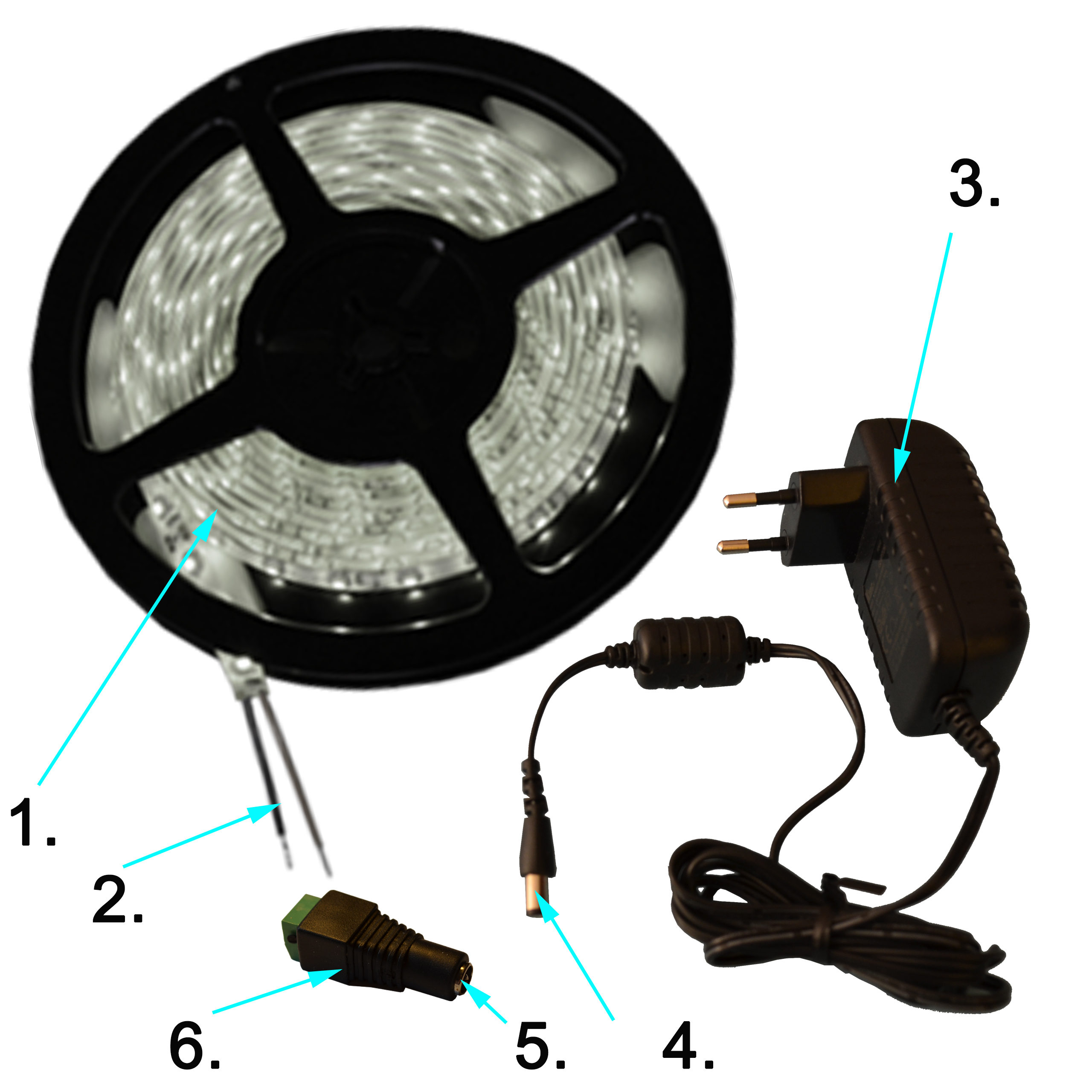 Вы получаете розетку постоянного тока, подключенную к ленте с одной стороны. Все, что вам нужно сделать, это распаковать и затем, чтобы получить одинаковый уровень яркости и добиться нужных параметров, подключить другой конец ленты к розетке постоянного тока (поместив кабель «+» от ленты в розетку постоянного тока). клемму с маркировкой «+» и кабель «+» -» из ленты в клемму с маркировкой «-» в розетке постоянного тока), подключите вилку блока питания 4 к розетке блока питания 5 в розетке постоянного тока 6 и подключите источник питания переменного тока напряжением 230 В. В случае настольных источников питания: подключите кабель питания к источнику питания перед подключением его к сети переменного тока 230 В.
