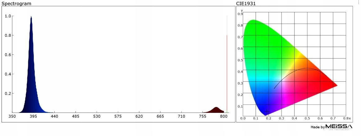 Цвет света ±10 %:УФ — 390 нм ± 5 нм — измеренный спектр