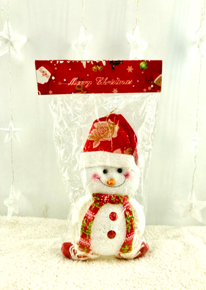 Светящийся снеговик — это сочетание плюшевого мишки и большой акриловой безделушки. Оснащен одним сильным мигающим светодиодом, светящимся цветами RGB — синим, красным, зеленым. Снеговик питается от трех батареек LR1130, входящих в комплект, которые можно заменить под украшением. Также имеется переключатель, активирующий действие.