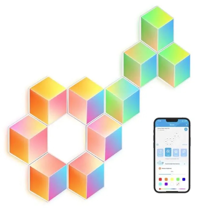 Наблюдайте за тем, как цвета перемещаются по каждой панели с помощью инновационной технологии RGBIC, которая позволяет цветам панели сливаться в единое целое. Более того, существует множество способов управления панелями. 3D-световые панели — это центр внимания, ожидающий вашей сборки. Создавайте произведения искусства, которые придадут вашим стенам объем и глубину.