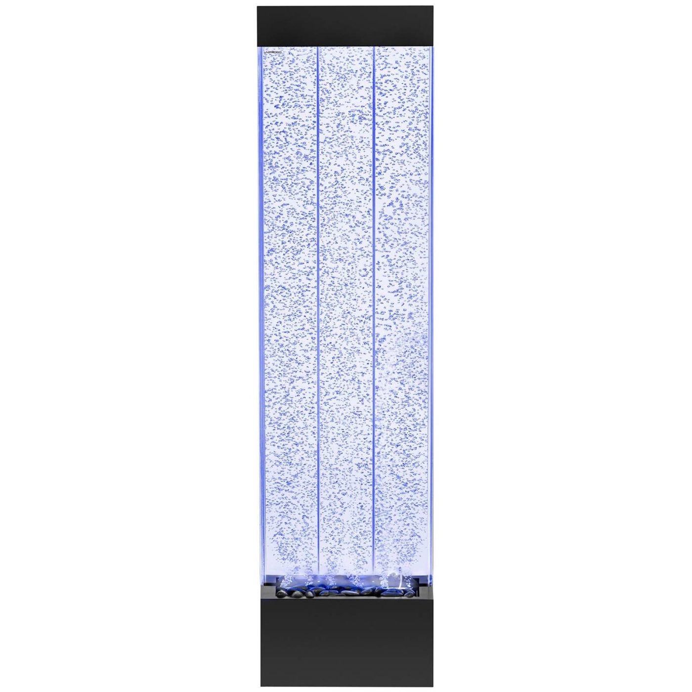 В основание встроен насос, который постоянно поднимает пузырьки воздуха в наполненный водой корпус. Благодаря 39 встроенным светодиодным лампам пузырьки эффективно подсвечиваются как снизу, так и сверху. Свет управляется с помощью пульта дистанционного управления с радиусом действия 3 м, поэтому вы можете легко настроить различные цвета и световые эффекты в водной стене. В дополнение к многочисленным цветам RGB доступны атмосферное мигающее, стробоскопическое, затемняющее и затемняющее освещение.