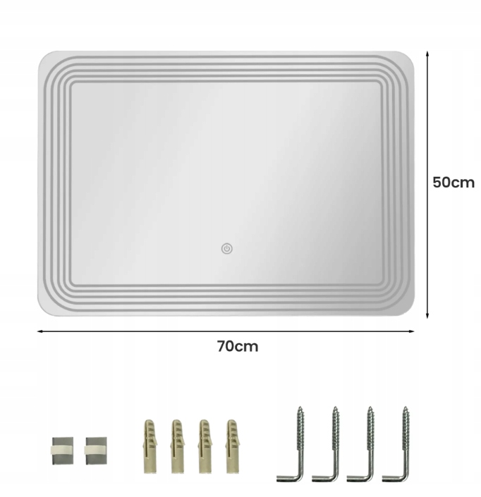 Легко установить с помощью монтажных комплектов.: в комплект поставки входят 4 монтажных комплекта. стене, для надежного крепления светодиодного косметического зеркала потребуется всего несколько минут. Иллюстрированные инструкции проведут вас через процесс установки. Размеры зеркала 70 х 50 см (длина х ширина). Обратите внимание, что установка допускается только горизонтально.