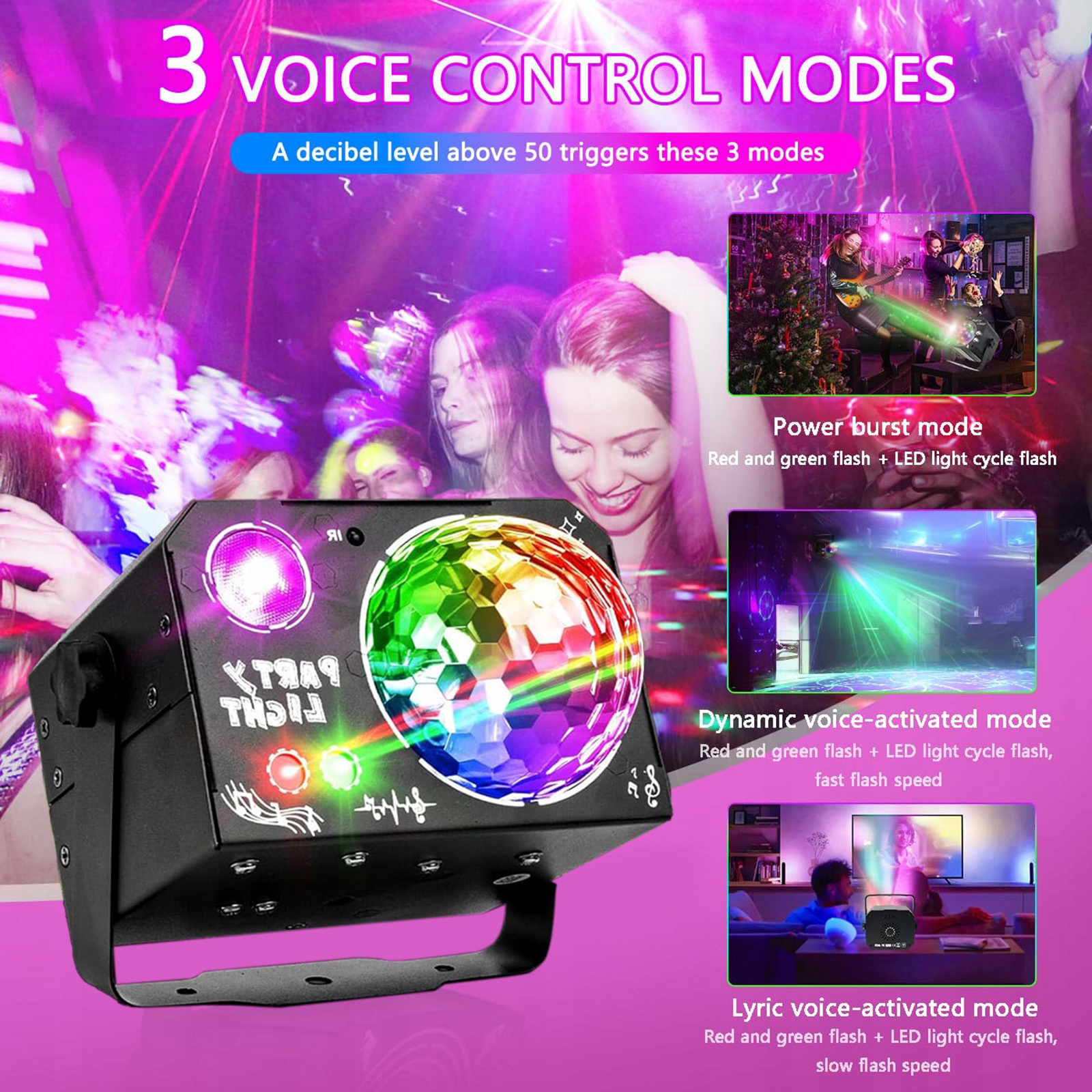 3 режимы управления музыкой и 3 автоматических режима: в режиме управления музыкой красные и зеленые огни звезд с 60 различными узорами, осветительные эффекты диско -шарики RGB и светодиодные изменения RGB к ритму окружающей музыки. В автоматическом режиме красные и зеленые светильники звезд, световые эффекты диско -диско и черного света или светодиодного светодиода RGB автоматически изменяются, создавая романтическую и мощную атмосферу.