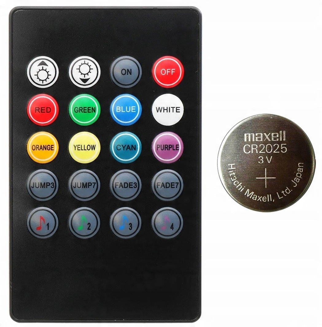 Пульт дистанционного управления управляется ИК-инфракрасный. Он оснащен 20 мембранными кнопками. С их помощью вы сможете выбирать между: 8 цветами и целых 4 режимами освещения! (JUMP3, JUMP7, FADE3, FADE7)