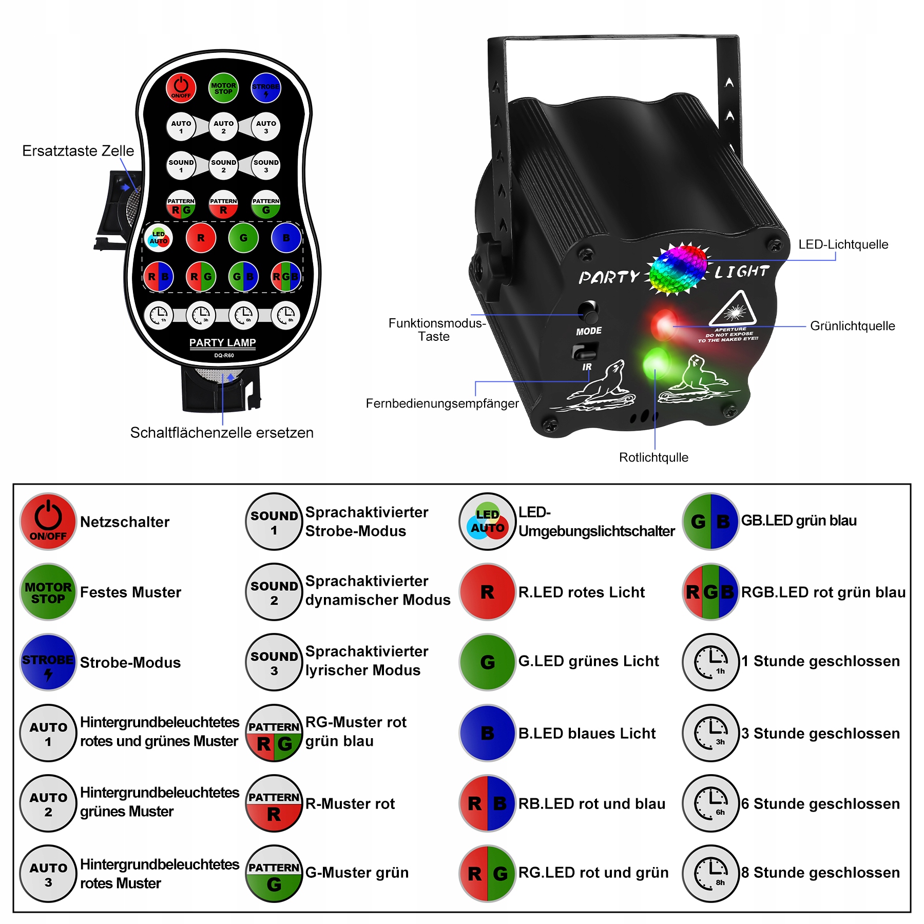 3 автоматических режима + 3 режима звука + 3 режима вспышки, вы можете свободно менять режим освещения и световой эффект с помощью пульта дистанционного управления и наслаждаться атмосферой отдыха.