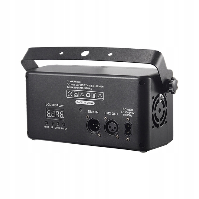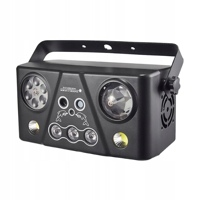 Источник света: 6 светодиодов RGB 3 Вт, 3 светодиода RGB 3 Вт, 1 красный лазер 100 мВт + 1 зеленый лазер 40 мВт + 2 белых светодиода 10 Вт стробоскопы