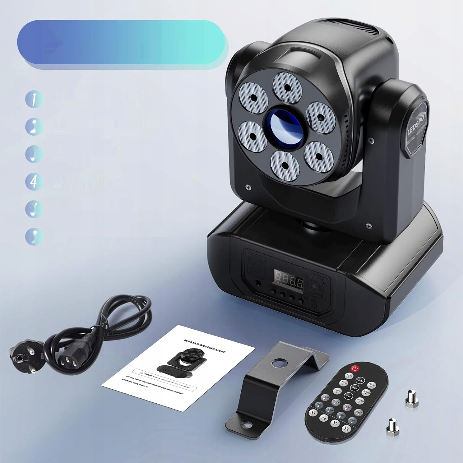Световые эффекты с движущейся головой: Этот диско-светильник состоит из 1 светодиода мощностью 60 Вт и 6 светодиодов RGBW 4-в-1 мощностью 8 Вт каждый. Он предлагает 8 цветов и 8 шаблонов, которые можно свободно менять между цветом, затемнением, стробоскопом, смешиванием цветов, монохромным и двухцветным эффектом. Свет покрывает большую поверхность и имеет высокую насыщенность цвета.