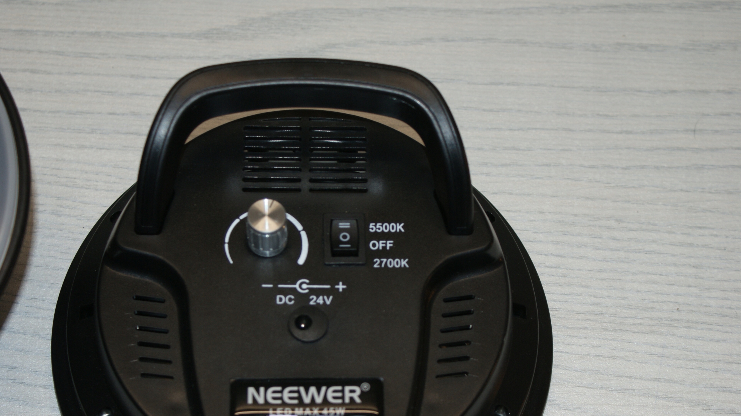 двухцветная диматическая светодиодная головка 45 Вт: 45W Светодиодные лампы с 2 цветовыми температурами (2700K и 5500K); Яркость (от 1% до 100%) может быть легко отрегулирована с помощью задней ручки; Вентилятор -в светодиодном охлаждающем головном вентиляторе головки улучшает рассеивание тепла во время эксплуатации, что увеличивает срок службы лампы.