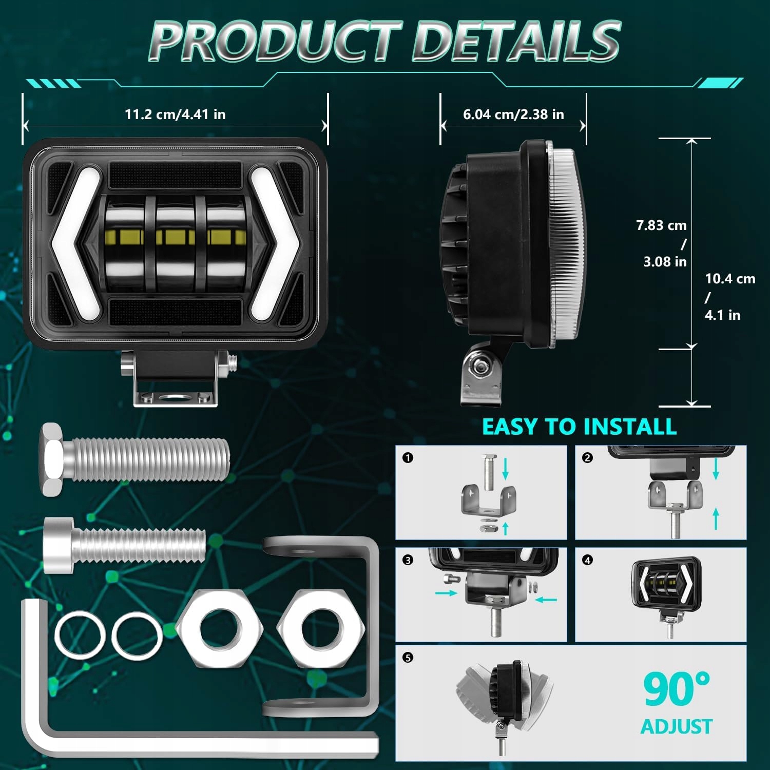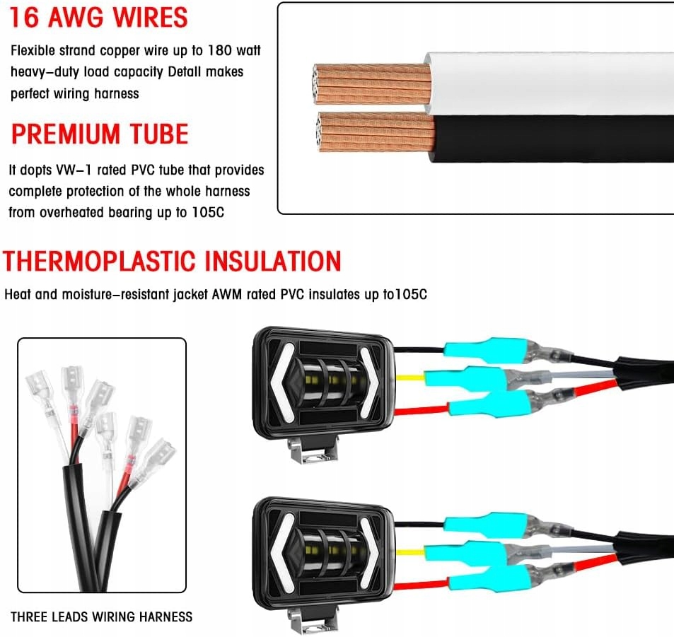 Включает регулируемые ручки (~90°) – легкое изменение направления освещения. Включает переключатель и жгут для быстрого подключения.