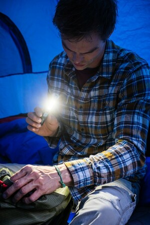 - Выдвижной держатель зажима Включите/выключение и переключение между верхним и основным светом, используя основную кнопку.
