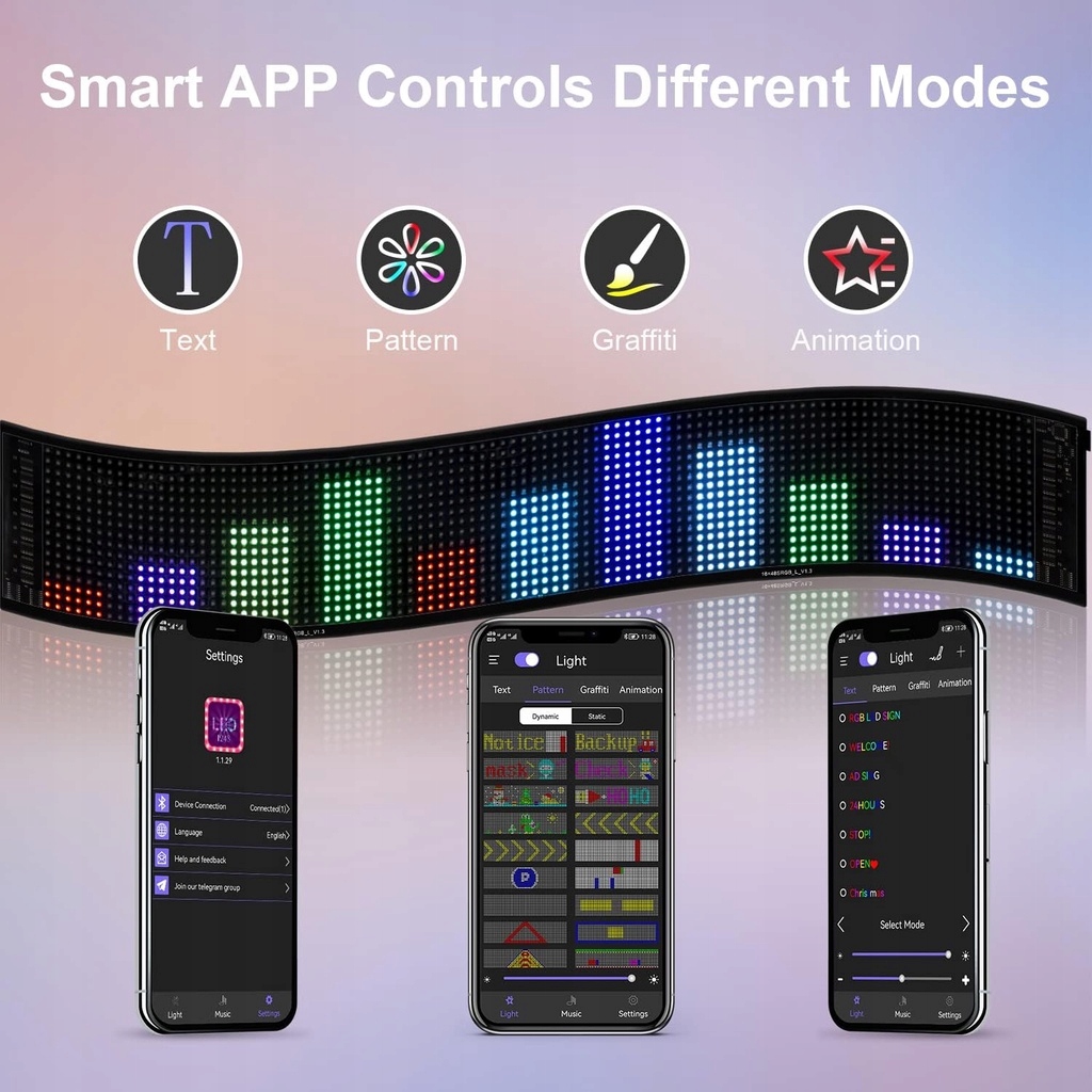 - шариковые лампы высокой яркости, 7 видов выбора цвета, регулируемая яркость, скорость прокрутки, режим отображения, можно добиться хорошего визуального эффекта как днем, так и ночью.