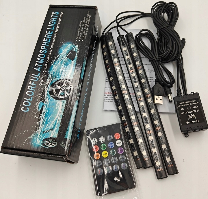 Удалите защитную полосу за клейкой лентой и поместите фонари под сиденья или в пространство для ног. Подключите USB-штекер к USB-порту. Теперь вы можете наслаждаться световыми эффектами!