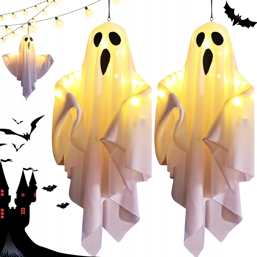 Вы получите 2 висящих света рождественской елки в форме духа 50 x 40 см, который украсит ваш Хэллоуин, создавая ужасающую и радостную атмосферу. Смешное лицо Духа не пугает вашего ребенка. Лампы питаются на 3 батареи LR44 (в наборе), просто удалите изоляционную фольгу из контейнера аккумулятора.