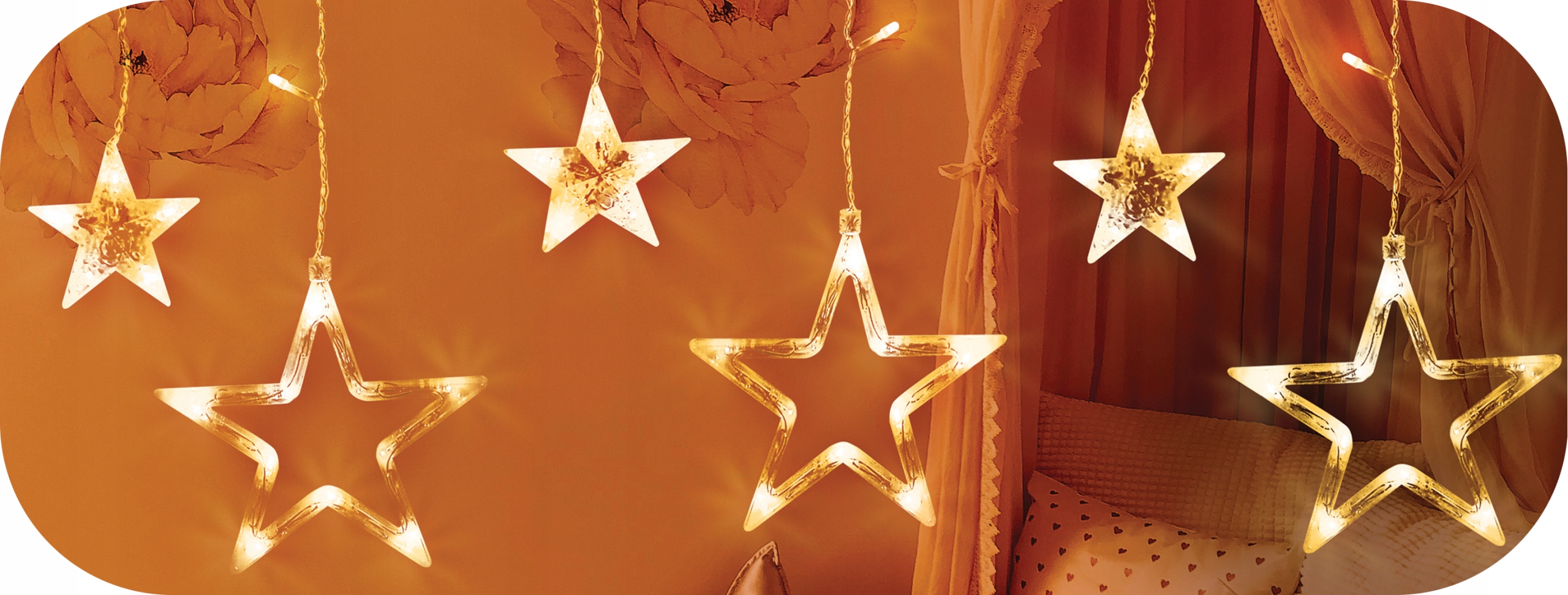 Лампы поставляются в инновационная форма висячих сосулек. По сравнению с традиционными светодиодными гирляндами, светильники состоят из свисающих сегментов, образующих занавес. Каждый сегмент заканчивается чередующейся большой и маленькой звездой.
