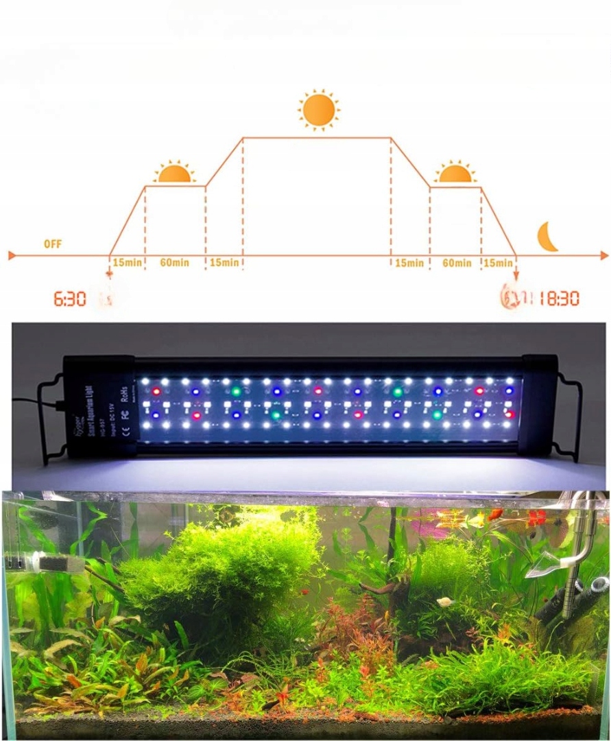 Цвет аквариумного освещения чисто оптический: темно-синий, зеленый, фиолетовый, голубой, желтый, красный, темно-красный (из режима запуска цветового цикла). Свет мягкий, индекс цветопередачи аналогичен естественному свету, до 89%, защищает глаза и рыбу. Использование высококачественных светодиодов модели 2835 + 5050, длительный срок службы, не менее 50 000 часов. Существует 10 видов яркости света, которые можно регулировать.