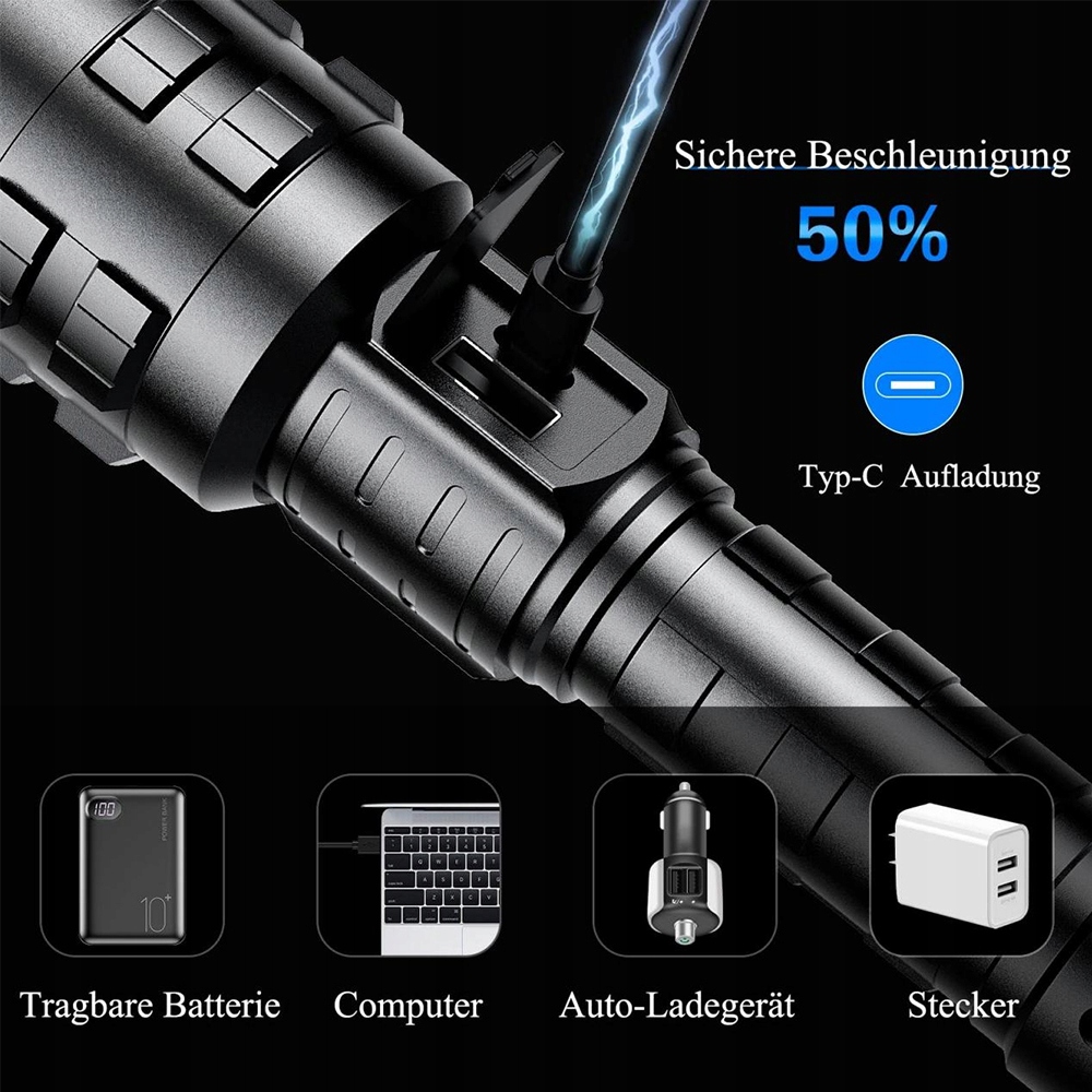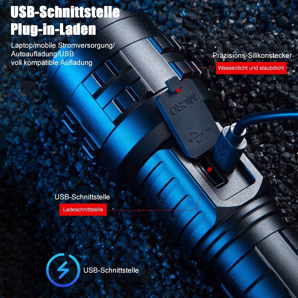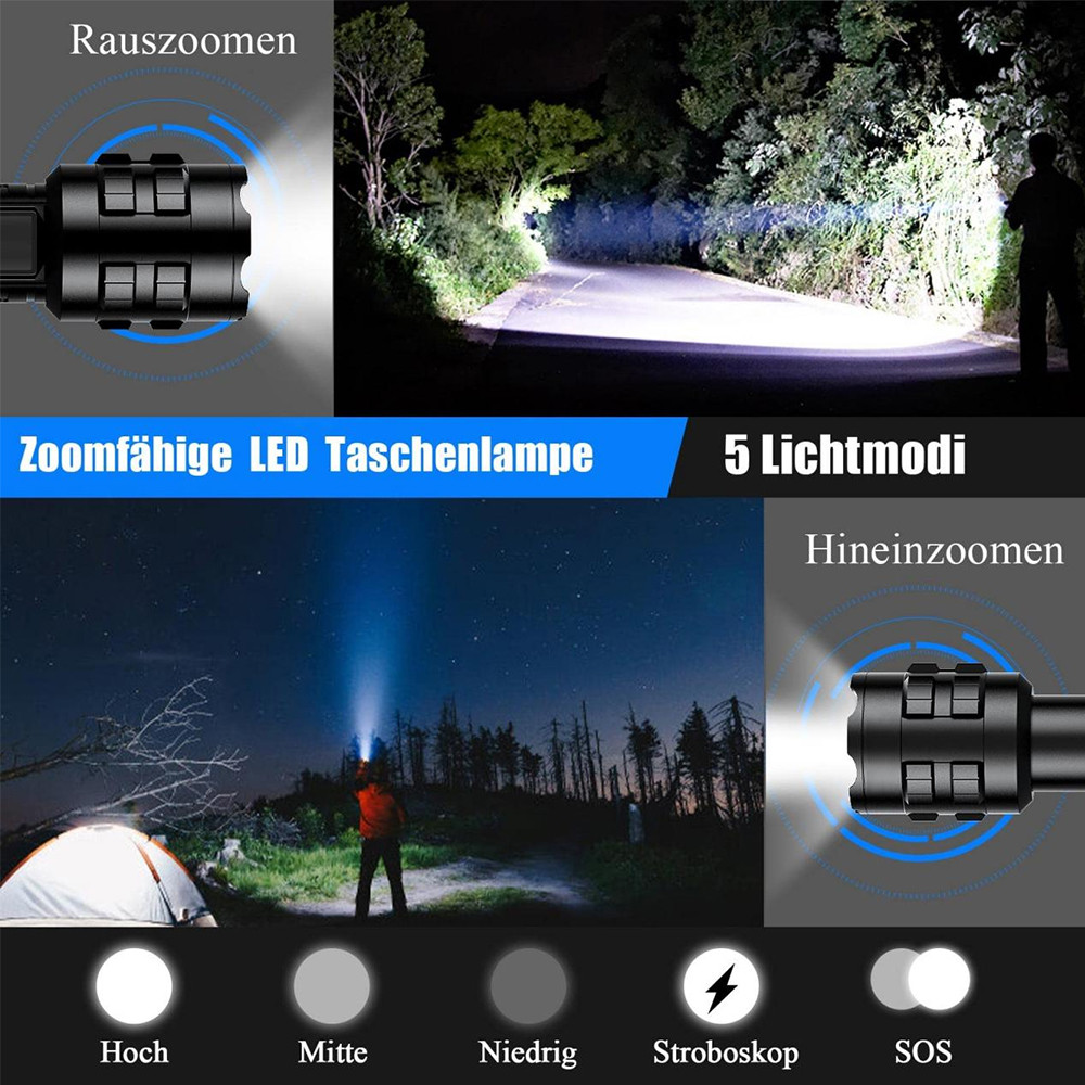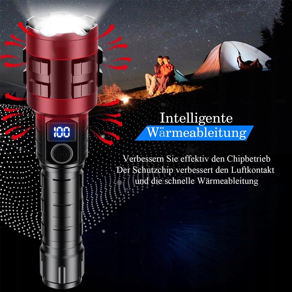 【Чрезвычайно яркий светодиодный фонарик】 Светодиодный фонарик XHP90 оснащен четырехъядерным чипом XHP90, обеспечивающим светоотдачу 15 000 люмен. Перезаряжаемый светодиодный фонарик имеет функцию масштабирования. Длина луча может достигать 3,5 футбольных полей на больших расстояниях. Луч дальнего действия может осветить помещение на расстоянии до 180 м2.