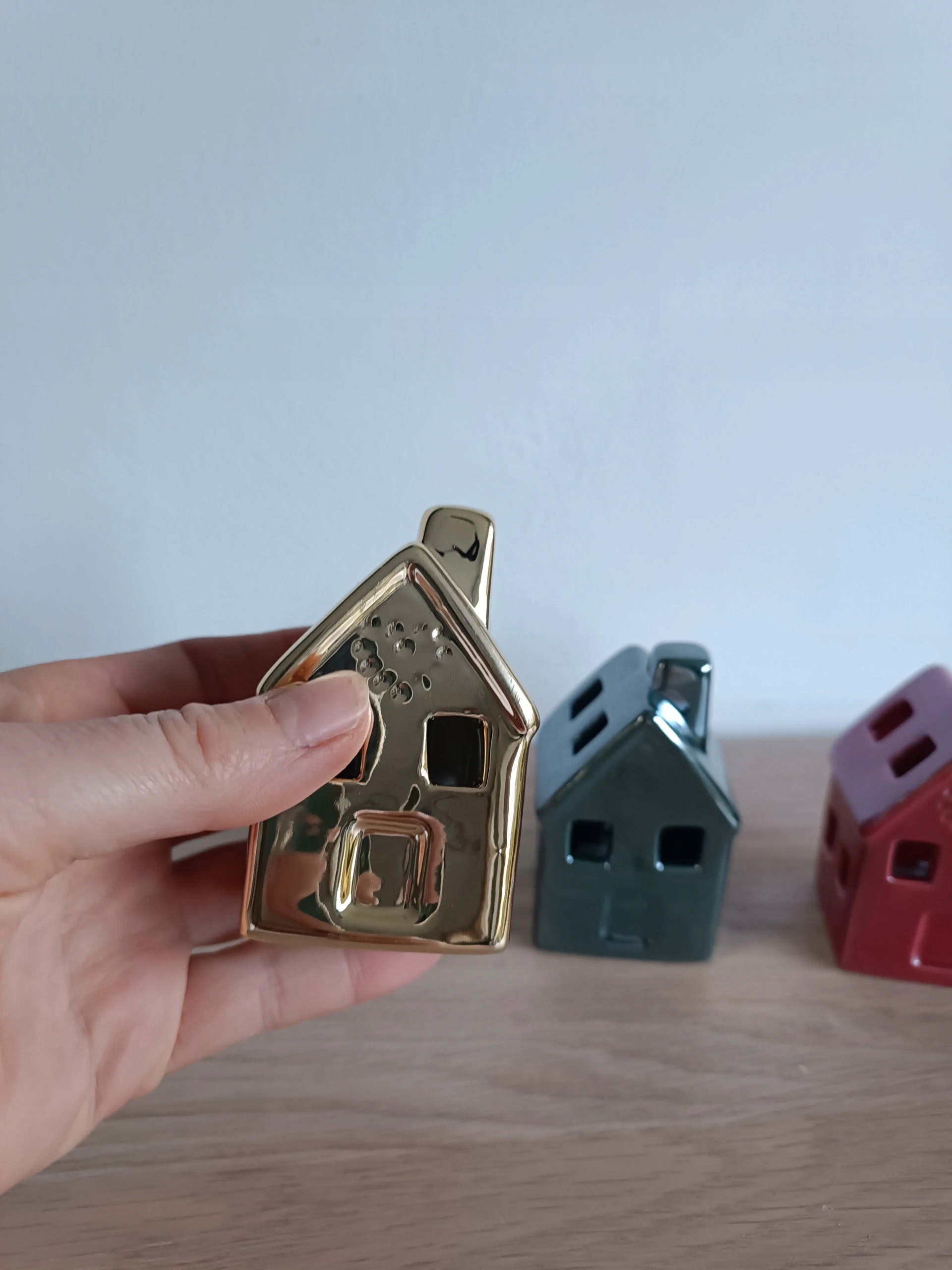 Домик выполнен из блестящей серебряной керамики.