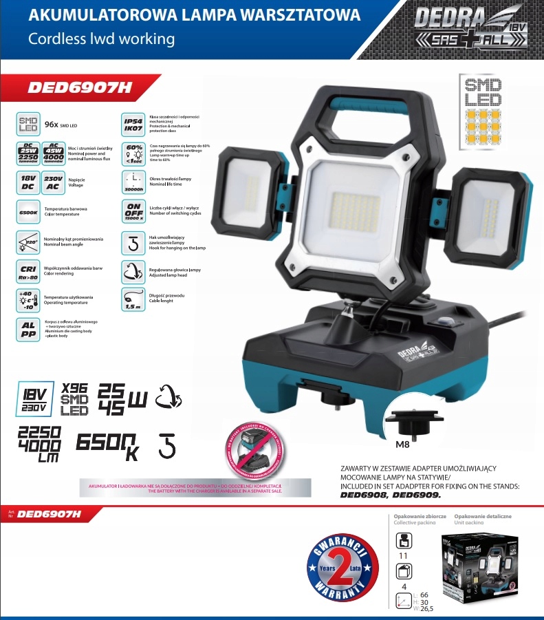 - Световая мощность – 2250 (18В)/4000 (230В) Люмен