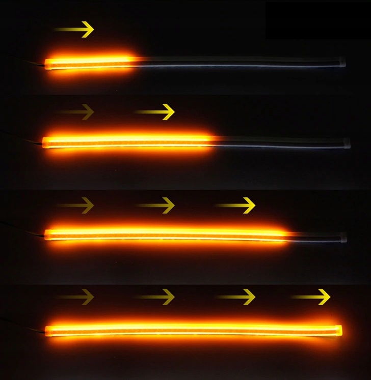 Комплект гибких светодиодных фонарей с функцией плавающего (динамического) указателя поворота. Светодиодные светильники ULTRA FLEX являются решением новейших технологий и предназначены для людей, желающих добиться уникального внешнего вида своих светильников. Каждая полоса имеет уникальную функцию плавного поворотника, как в последних моделях автомобилей. Последовательное управление означает, что когда мы включаем указатель поворота во время работы в качестве дневных ходовых огней, красный свет временно выключается и снова включается, когда мы выключаем указатель поворота. Фантастический эффект, равномерный световой луч, простая установка. Современные светодиоды обеспечивают отличную видимость на дороге. Светодиодные фонари не только экономят деньги (увеличивают срок службы и в несколько раз снижают энергопотребление), но и безопасность.