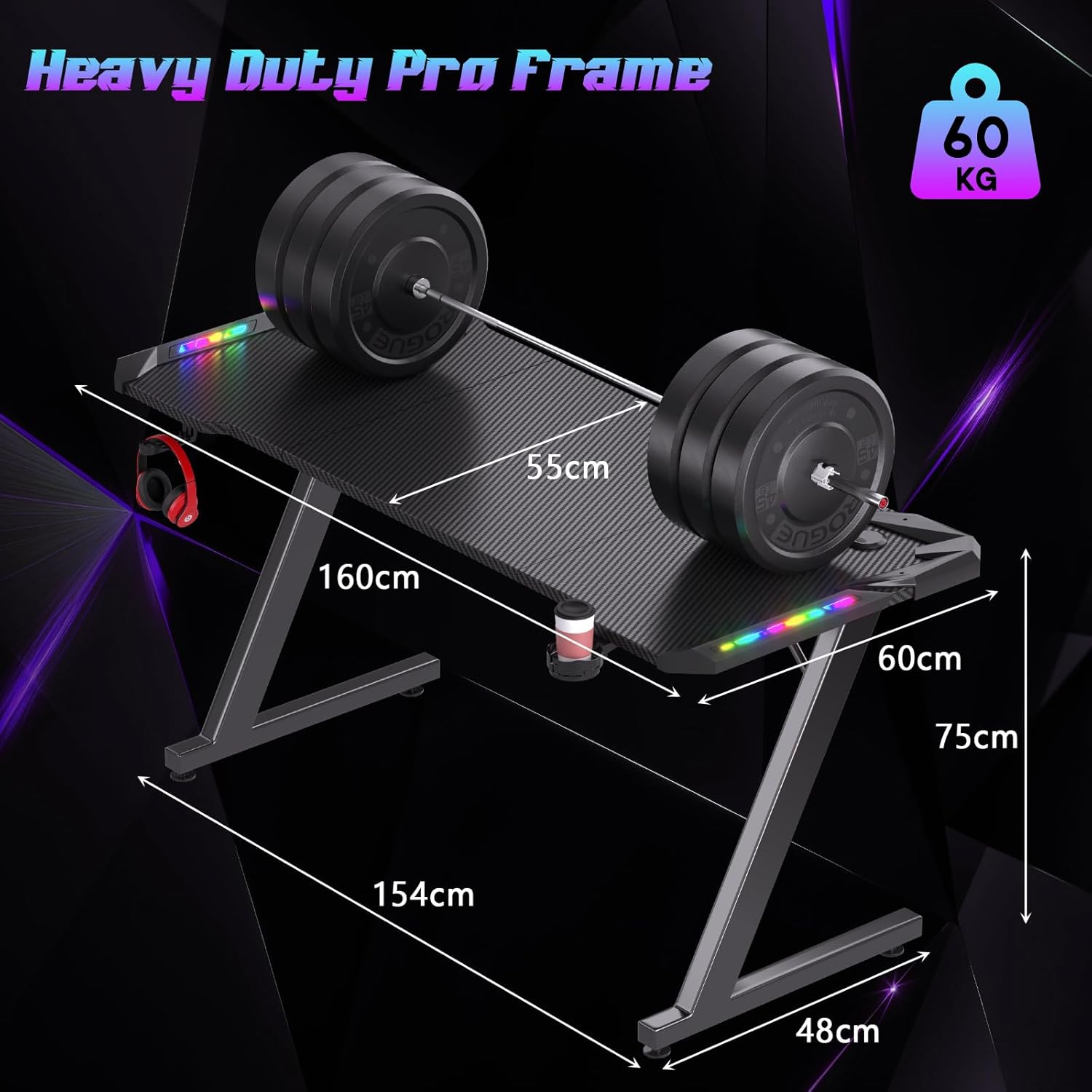 【Просторная поверхность игрового стола】Игровой стол предназначен для размещения всего вашего игрового оборудования, его столешница размером 160 x 60 см обеспечивает огромное пространство для монитора любого размера и игровых аксессуаров, которые у вас есть. Таким образом, вы сможете сосредоточиться на игре, не отвлекаясь на мелкие детали. Текстурированный рабочий стол из углеродного волокна гладок на ощупь, устойчив к воде, поту и царапинам. Мы поможем вам выиграть матч!