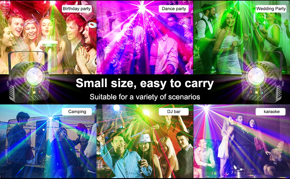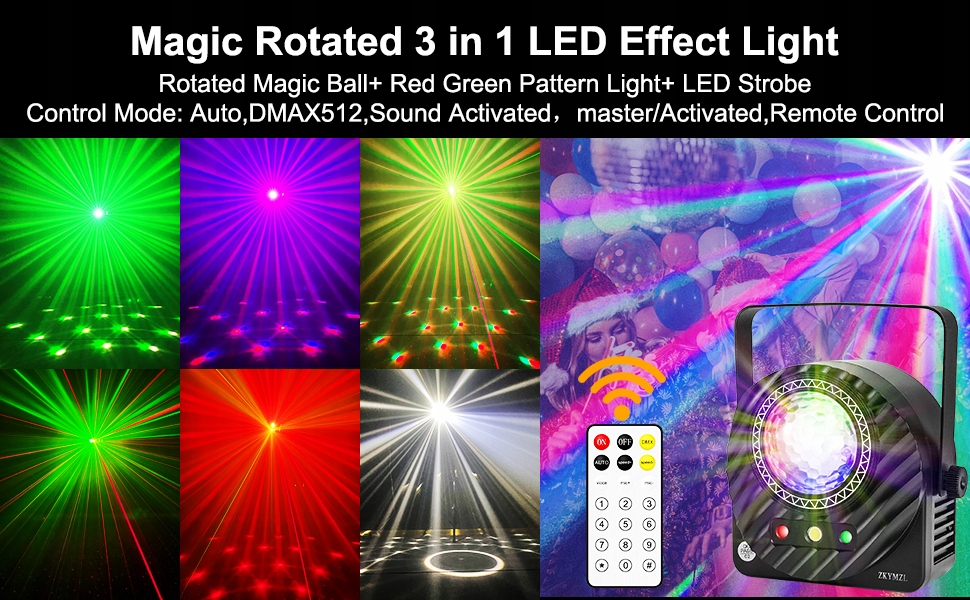 【Многократный свет в 1】 Белый стробоскоп, волшебный шар светодиодного калейдоскопа, красный и зеленый луч и узор с дистанционным управлением, режимы DMX и главный-подчиненный.