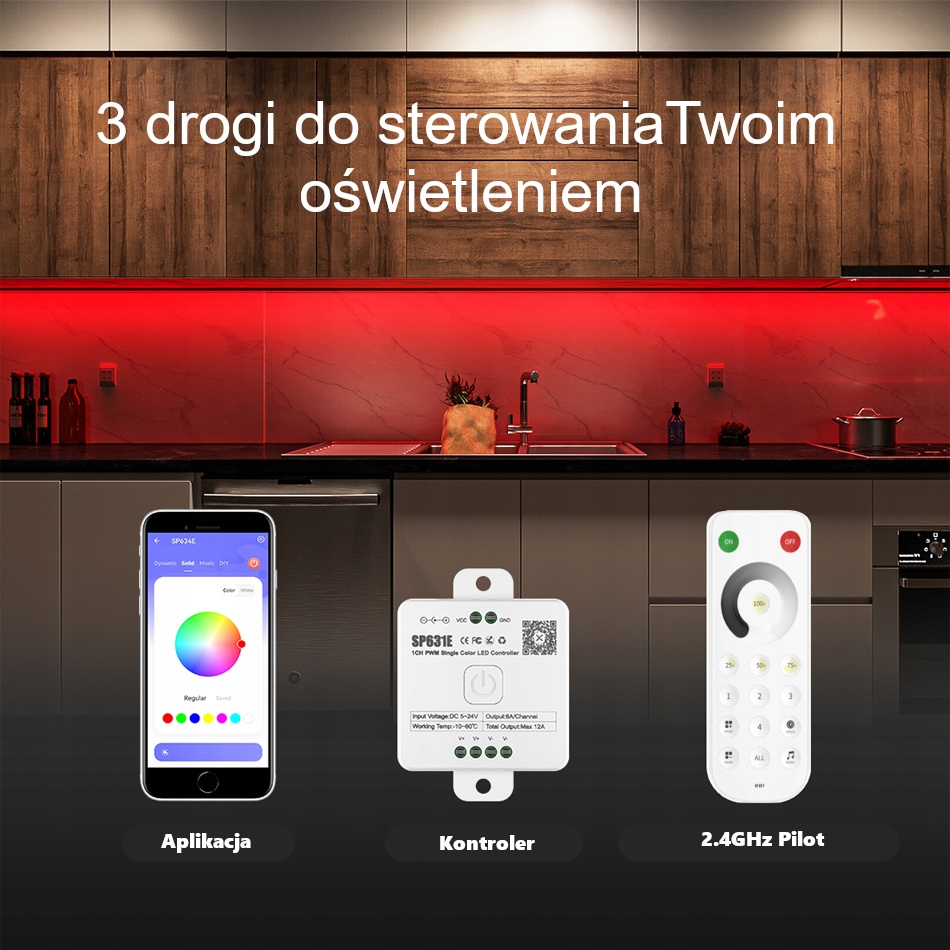 контроллер SP631E является идеальным выбором для управления отдельными светодиодными лентами. Используя отвертку, которую можно найти в наборе, мы прикручиваем кабели от светодиодной полосы, а на другой стороне устройства - шнур питания. Контроллер имеет встроенный музыкальный контроллер , который адаптирует частоту освещения ленты к ритму музыки. Наличие приложений banlanx мы можем управлять светодиодной лентой с помощью смартфона