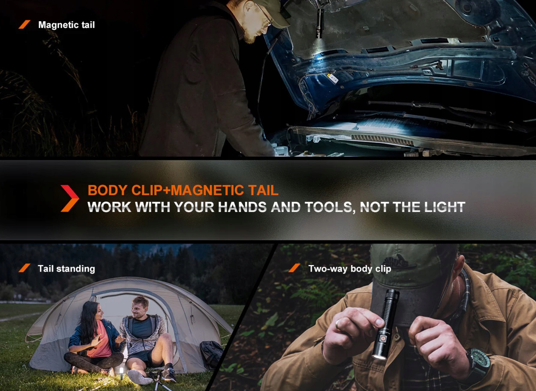 Благодаря использованию двусторонней клипсы фонарь можно легко закрепить на ремне, рюкзаке или на козырьке кепки в качестве импровизированного налобного фонаря. Фонарик LD30 также имеет очень полезный индикатор уровня заряда батареи (светодиод в боковом переключателе), защиту от перегрева и обратной полярности, а также функцию предупреждения о низком заряде батареи. На задней крышке имеется магнит, который позволяет прикрепить фонарь, например, к капоту автомобиля, что позволяет работать обеими руками.