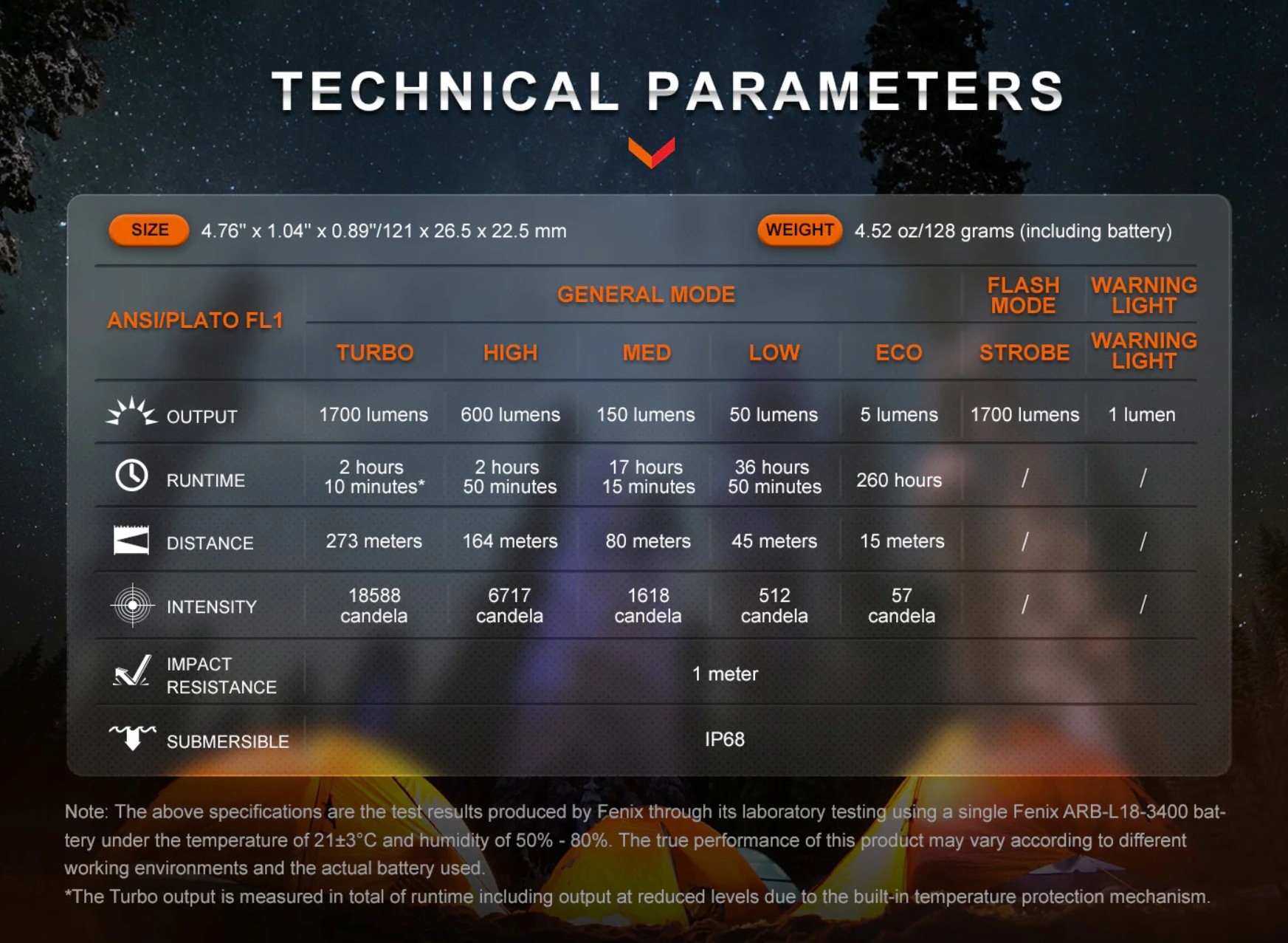 Источником света является LUMINUS SST40 LED нового поколения, излучающий максимальный световой поток 1700 люмен на расстоянии до 273 м. Холодный нейтральный цвет света снижает утомляемость глаз, обеспечивает более естественную цветопередачу и лучшую видимость деталей. В фонарике используется коллимационная линза с высоким светопропусканием и отражатель из апельсиновой корки, которые обеспечивают равномерное и широкое рассеивание светового потока, эффективно освещая центр и края сцены перед нами.