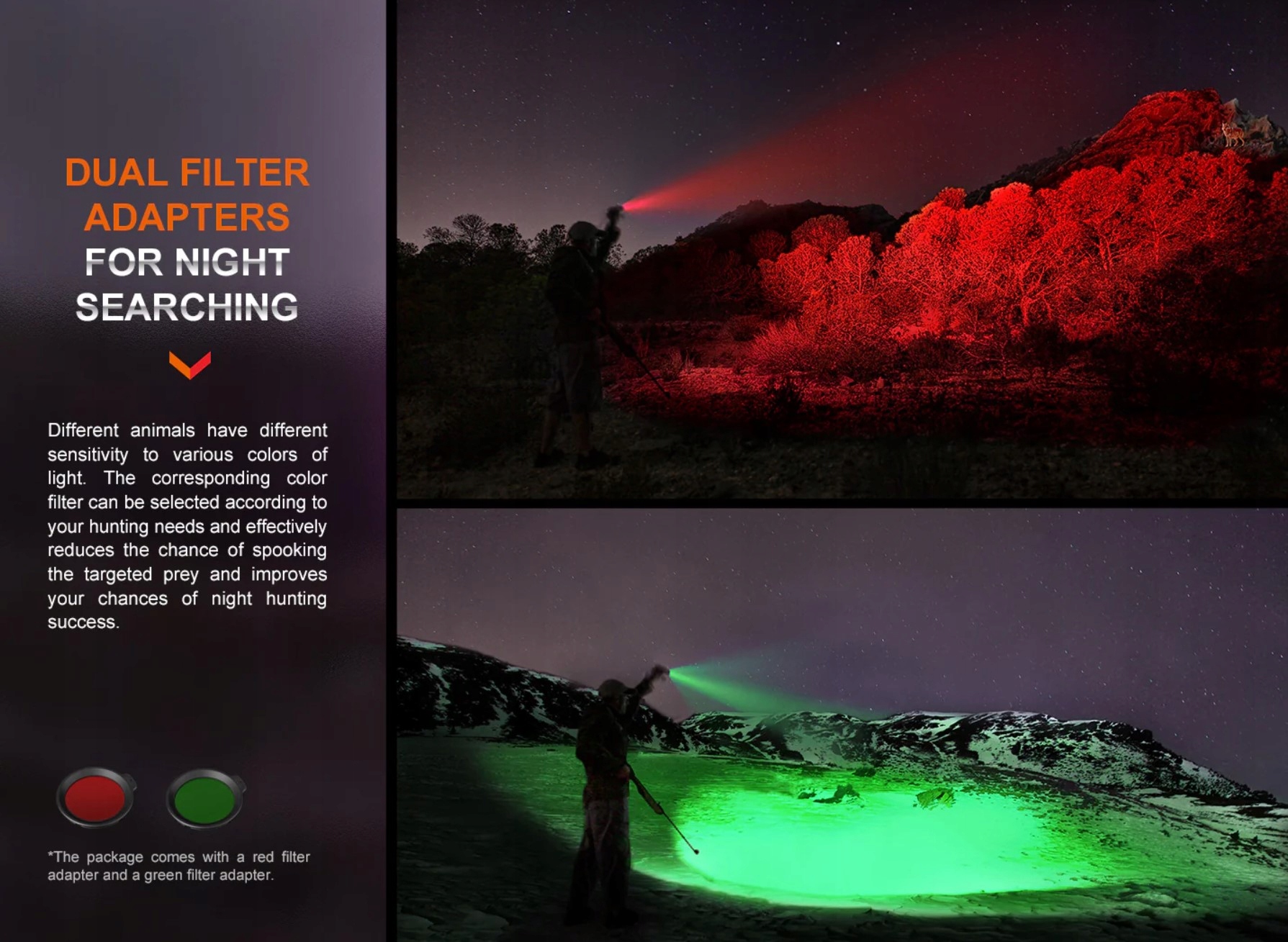 Источником света является диод Luminus SFT70 нового поколения, генерируя максимальный световой поток 2500 люменов. Излучаемый имеет прохладный белый цвет 6500 К, который отлично работает на фонариках с большим диапазоном. Человеческий глаз получает «холодный свет» как сильнее, поэтому он лучше всего подходит для освещения области и отдаленных предметов. Возможности фонариков значительно увеличивают в красочных фильтрах, применяемых к головке . Зеленый фильтр является проверенным решением для охотников , потому что большинство животных не реагируют на зеленый свет, что облегчает подход и преданность точного выстрела. Этот дизайн отлично фокусирует световой поток, , который переводится в впечатляющий диапазон до 1100 м. Охота